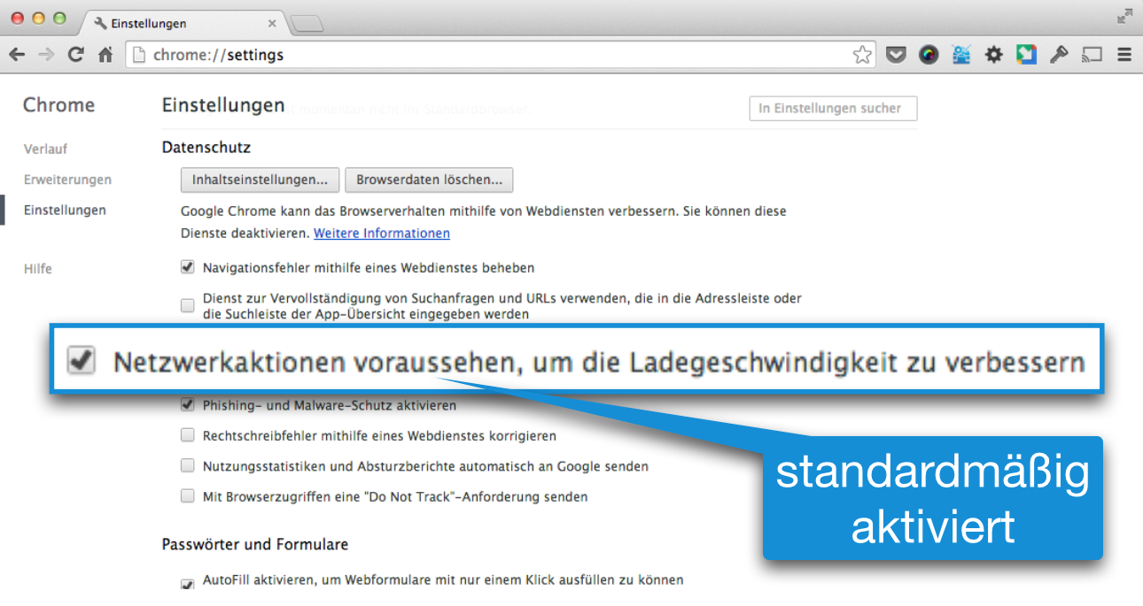 Die Frage lässt sich sehr leicht beantworten. In den erweiterten Chrome-Einstellungen (Einstellungen > Erweiterte Einstellungen anzeigen) findet man im Bereich Datenschutz eine Funktion, die sich „Netzwerkaktionen voraussehen, um die Ladegeschwindigkeit zu verbessern“ nennt. Diese Funktion ist standardmäßig bei allen Nutzern aktiviert. Nur ein kleiner Prozentsatz dürfte sie deaktiviert haben.