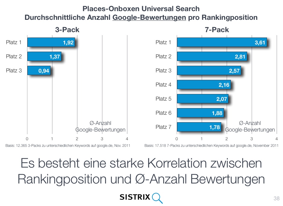 „Google Places Seiten mit vielen Google-Bewertungen besitzen im Schnitt ein besseres Ranking in den Places-OneBoxen“.