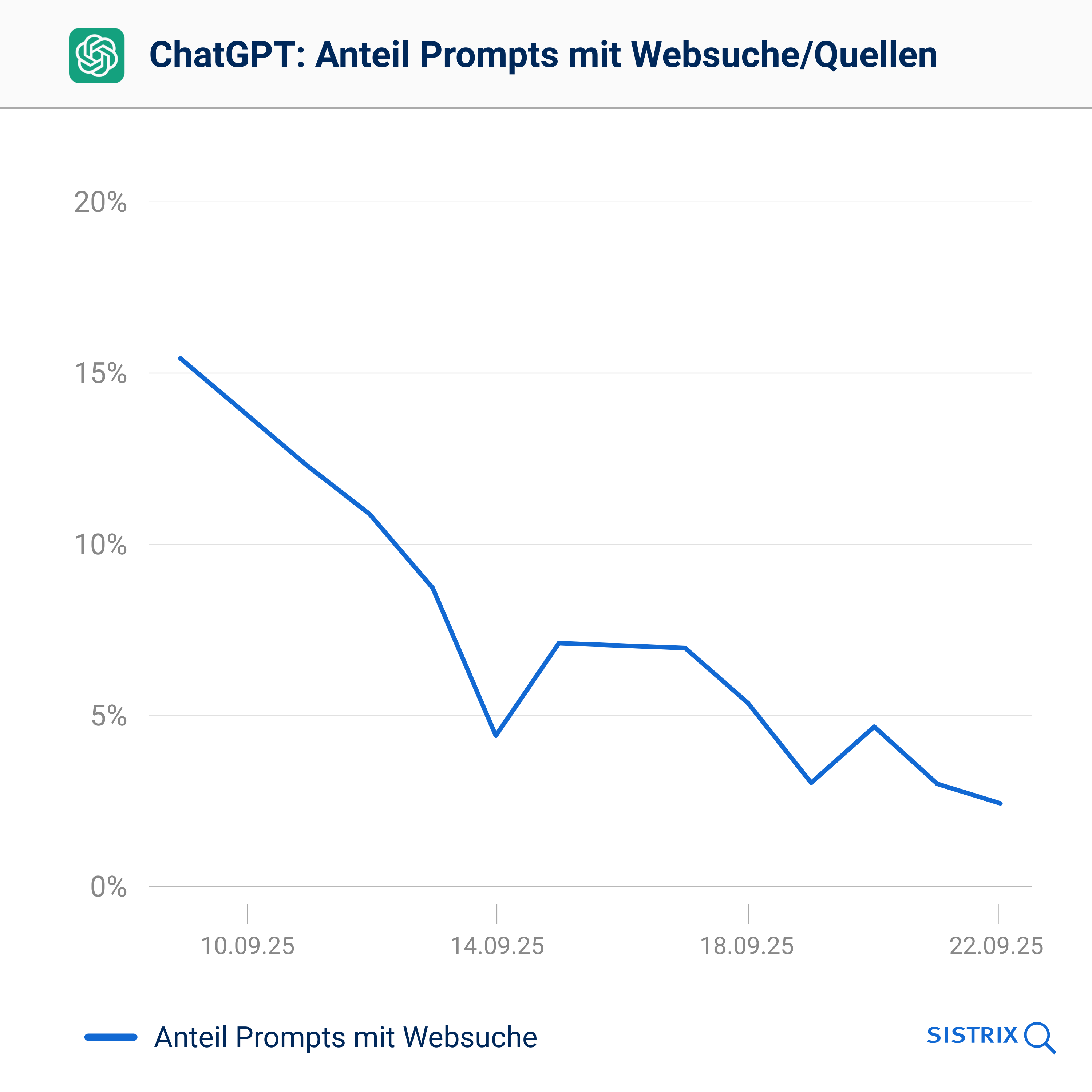 Aus Neugier analysieren wir täglich zahlreiche Antworten von ChatGPT auf ganz unterschiedliche Prompts. In den letzten Wochen haben wir festgestellt, dass ChatGPT deutlich seltener eine Websuche nutzt.