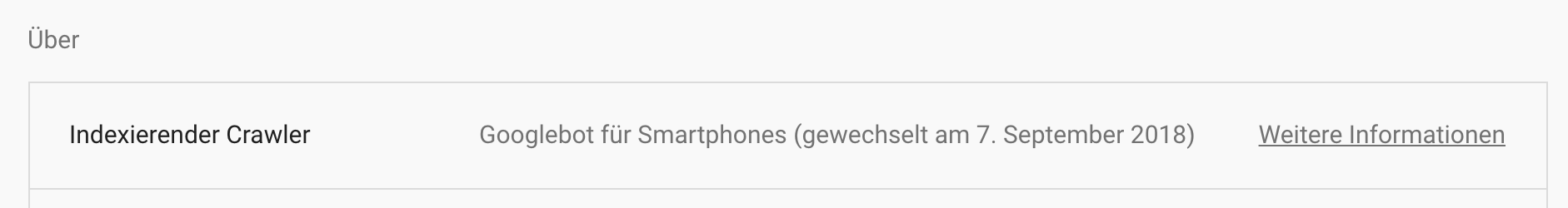 - Indexiert Google deine Webseite mit dem Smartphone-Googlebot? Google hat angekündigt, in diesem Monat den Desktop-Googlebot einzustellen. Ist deine Webseite noch nicht automatisch auf den Smartphone-Googlebot umgestellt, deutet das auf Indexierungsprobleme hin. Jetzt in der Google Search Console checken: Einstellungen > Über (Screenshot)
