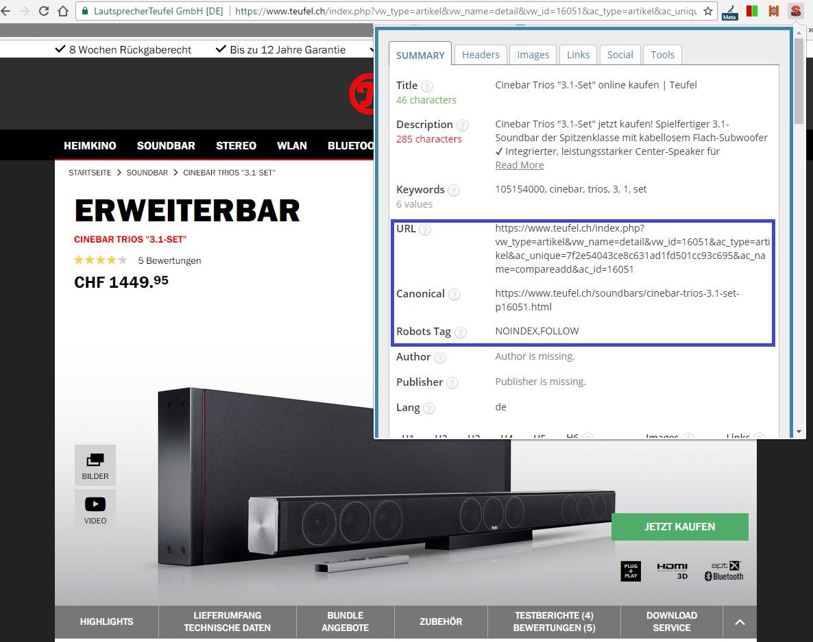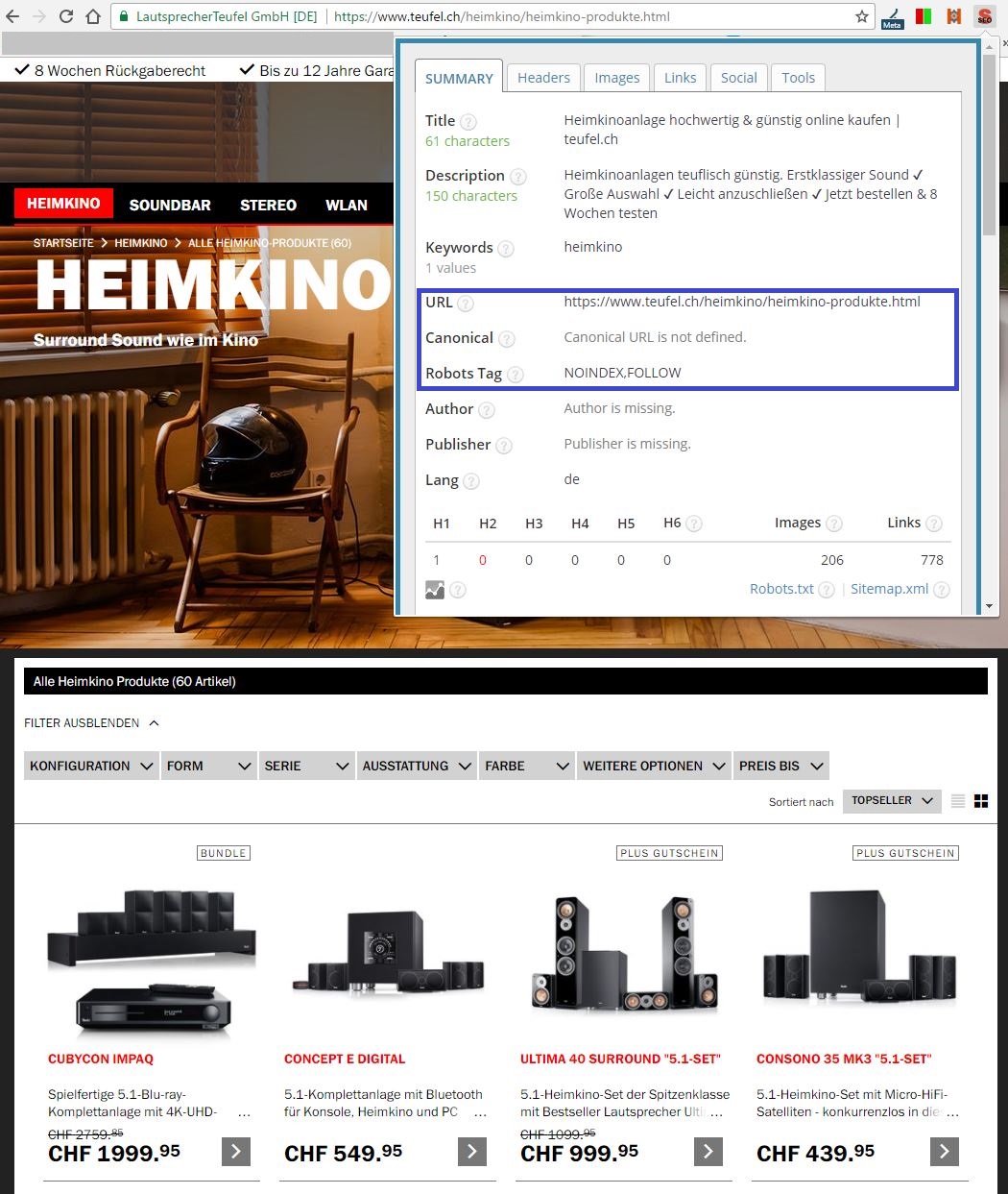 Schauen wir uns zunächst teufel.ch an. Bei genauerer Betrachtung einiger Seiten dieser Domain fällt zum Teil folgendes auf: Produktübersichtsseiten, wie bspw. ‚heimkino-produkte‘ (oder ‚wlan‘) wurden auf noindex gestellt.