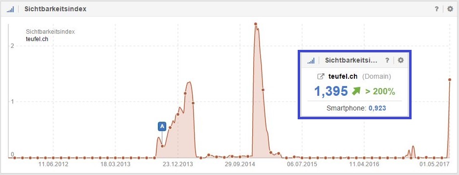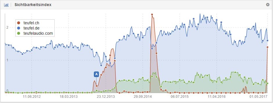 Teufel.ch, die Schweizer Webseite des Herstellers von Lautsprechern, Hi-Fi und Heimkinosystemen, kann eine Sichtbarkeitsveränderung von über + 200% verbuchen (01.05.2017) und fällt mit diesem Zuwachs in der Liste der ‚Top Gewinner‘ sofort auf. Nicht nur die prozentuale Veränderung der Sichtbarkeitspunkte, sondern auch der Verlauf der Sichtbarkeit in der zeitlichen Betrachtung zeigt eine interessante Entwicklung: Extrem spitzen und hohen Spikes folgt ein kompletter Sichtbarkeitsverlust bis auf 0 Punkte hinab.