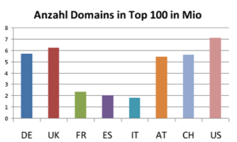 Der Wettbewerb in Deutschland hat leicht angezogen – im Vergleich zu UK schaut das aber noch harmlos aus. Dort gibt es über 15% mehr verschiedene Domains in den Top 100. Das ist schon deutlich. Bei Frankreich und Italien gab es weniger starke Erhöhungen des Wettbewerbs in den SERPs. Bei Spanien jedoch sehr deutliche, mit ca. 20% mehr Domains in den SERPs. Die Frage ist, ob es sich hier wirklich um Domains „aus Spanien“ handelt oder ob es Domains aus den südamerikanischen, spanischsprachigen Ländern sind. Dort ist die Internetaktivität in den letzten zwei Jahren explodiert. Auch könnten die Domains aus den USA sein und auf die lateinamerikanische Bevölkerung ausgerichtet sein. Hochinteressant sind natürlich die Daten zu den „neueren“ Ländern der Toolbox. Bei Österreich und der Schweiz ist es sehr beeindruckend, dass hier fast Zahlen wie in Deutschland erreicht werden, obwohl die Länder um ein vielfaches kleiner sind. Sicherlich kommen auch viele der Domains, die in Österreich und der Schweiz ranken, aus Deutschland. Die Daten aus den USA setzen offensichtlich eine neue Messlatte – das aber nur auf den ersten Blick! Wenn man nur diese Daten, also die Anzahl der Domains in den Top 100, hätte, könnte man zu dem Schluss kommen, dass SEO in den USA am wettbewerbsintensivsten ist gefolgt von UK auf zweiter und Deutschland erst auf dritter Stelle. Diesen Schluss sollte man jedoch nicht zu früh ziehen! 😉