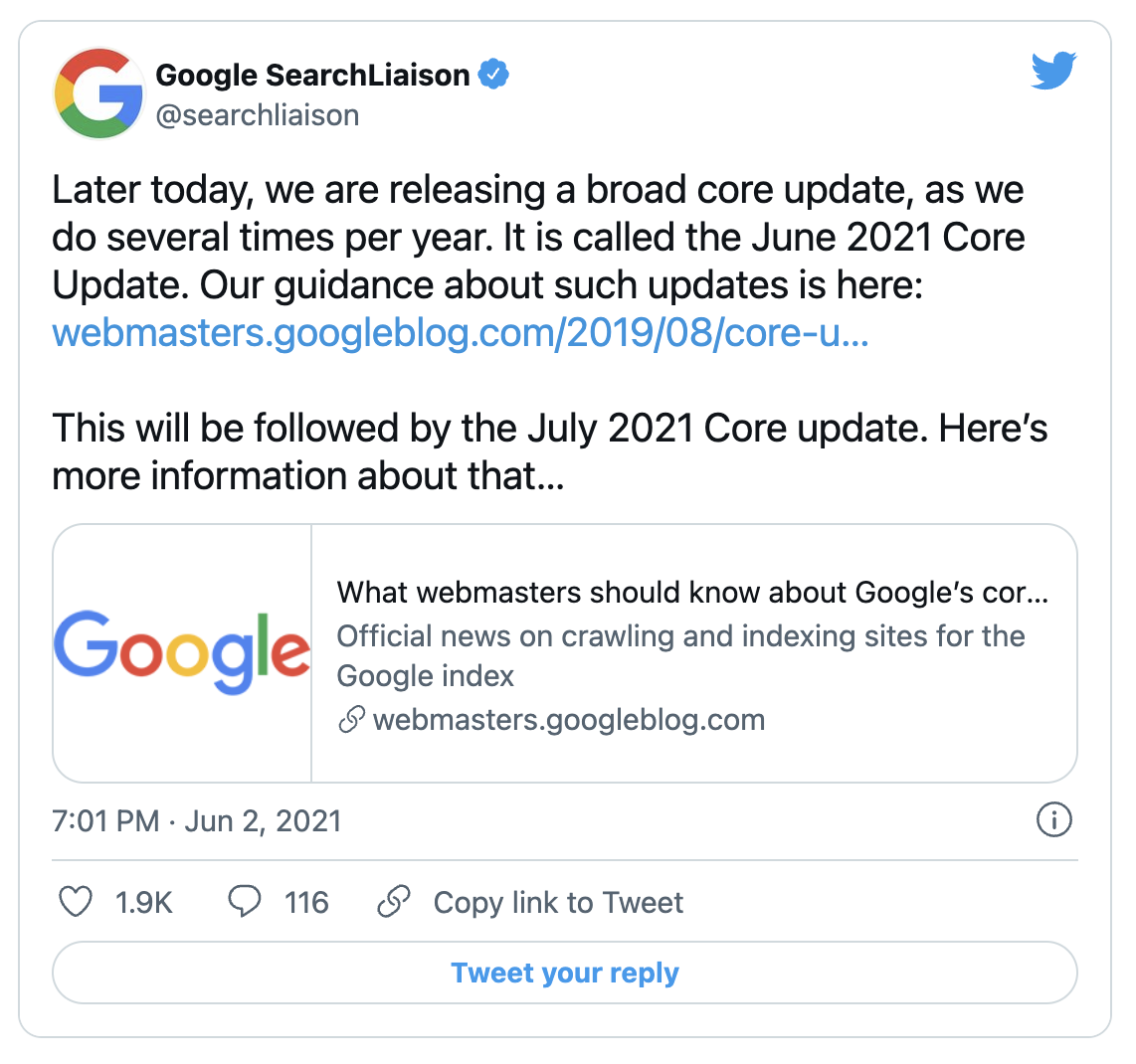 Dabei müssen “SEO-Experten” gar nicht “ratlos” sein. Google selber bestätigt große, relevante Google-Updates über den Twitter-Account @searchliaison seit einigen Jahren sehr zuverlässig: