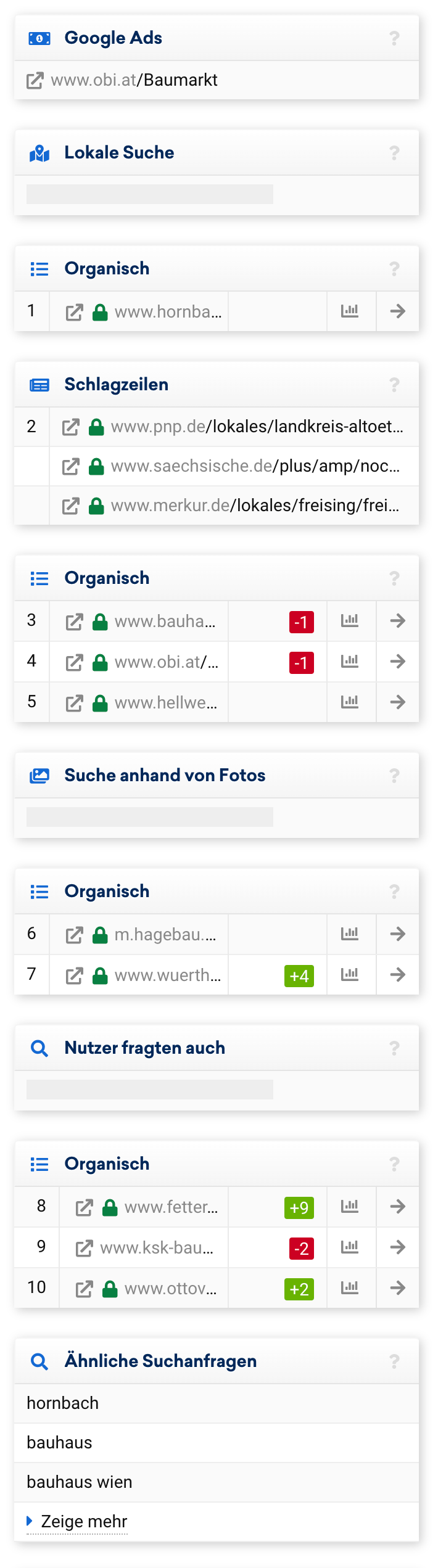 Für viele der Treffer-Typen werten wir zusätzlich die Inhalte aus: bei den Schlagzeilen siehst du, welche Nachrichten verlinkt sind, bei Bilder-Boxen welche Bilder angezeigt werden und so weiter. Auch weitere Suchanfragen, lokale Geschäfte und vieles mehr werden im Detail analysiert.