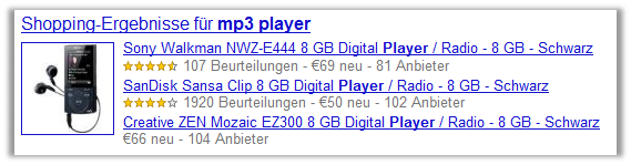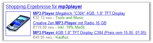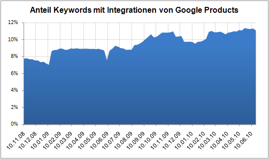 In den letzten Wochen und Monaten hat Google seine Aktivitäten im Bereich Shopping und E-Commerce weiter ausgebaut. Es scheint, als gebe man sich nicht länger mit der Rolle des reinen Vermittlers zwischen den Suchenden und Onlineshops zurecht, sondern wolle ein größeres Stück vom Kuchen abhaben. So wurde zum Beispiel die Google Commerce Search neu aufgelegt. Version 2.0 der internen Suche speziell für Onlineshops bringt einige Neuerungen und kostet nur noch die Hälfte, dürfte sich deswegen schneller verbreiten und Google wertvolle Daten liefern. Spannendere Veränderungen finden auch bei Google Products, dem früheren Froogle statt: zwar steigt der Anteil der Suchanfragen mit einer Google Shopping-Integration nur leicht, wie an diesem Diagramm zu sehen ist. Die Art der Integration wird allerdings zunehmend geändert: waren es früher Direktlinks zu den Shops, gehen mittlerweile viele der Links als Deeplink auf die Detailseite von Google Products. Dort hat Google in den letzten Monaten einen kompletten Preisvergleich mit Produktüberblick, zusammengecrapten Meinungen und Preisen der teilnehmenden Shops aufgebaut und geht jetzt dazu über, bei fast allen trafficstarken Keywords diese Verweise der Universal-Search-Integrationen auf diese Seiten umzubiegen. In den USA sind die Ergebnisse bereits zu bestaunen.