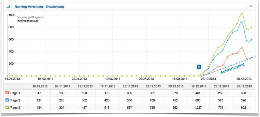 Schaut man sich die Verteilung der Rankings von huffingtonpost.de an, so sieht man auch dort das stetige Wachstum, das für die nächsten Jahre noch viel Platz nach oben bietet. Der Weg in die Topliga der deutschen Nachrichtenportale ist auch im SEO-Bereich lang und steinig.