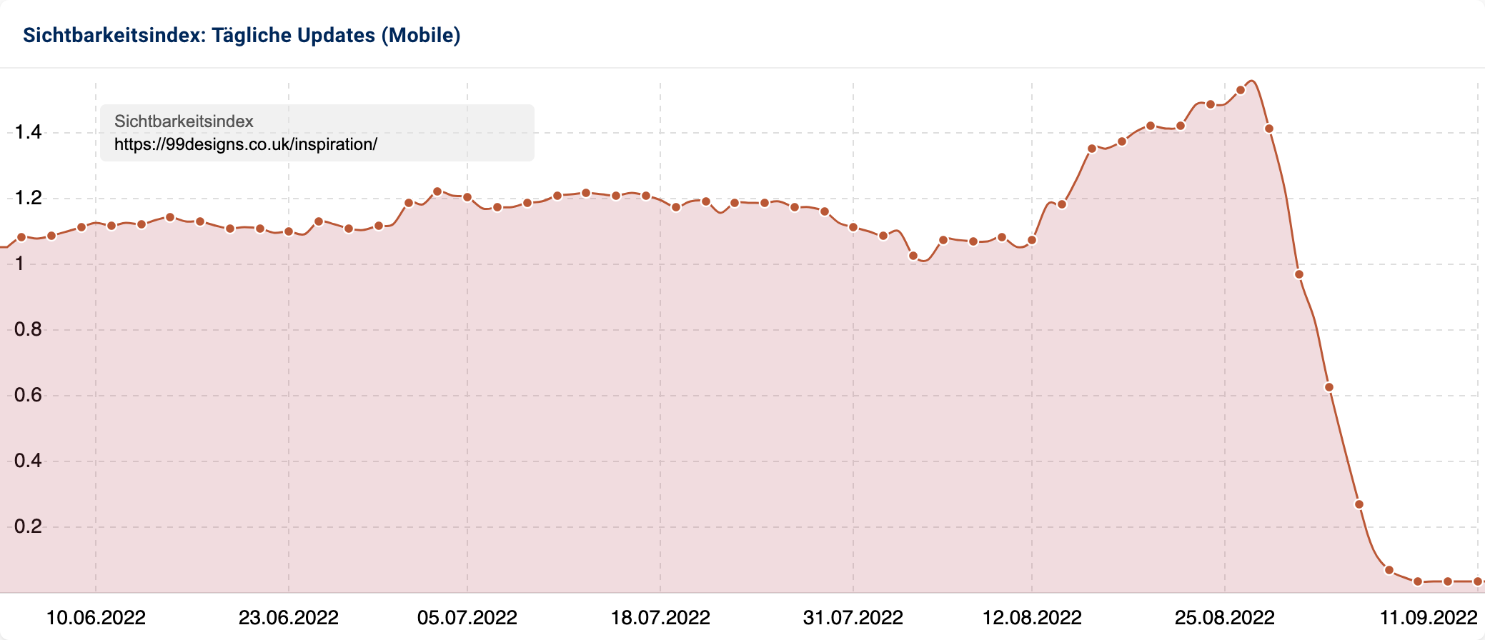 99designs, ein Marktplatz für Design- und Logoarbeiten, hat auf Google.co.uk rund 50% an Sichtbarkeit verloren: von 3 Punkten auf nur noch knapp 1,5 Punkte. Geht man der Ursache etwas weiter auf den Grund, sieht man, dass nur ein Verzeichnis für diesen Verlust verantwortlich ist: