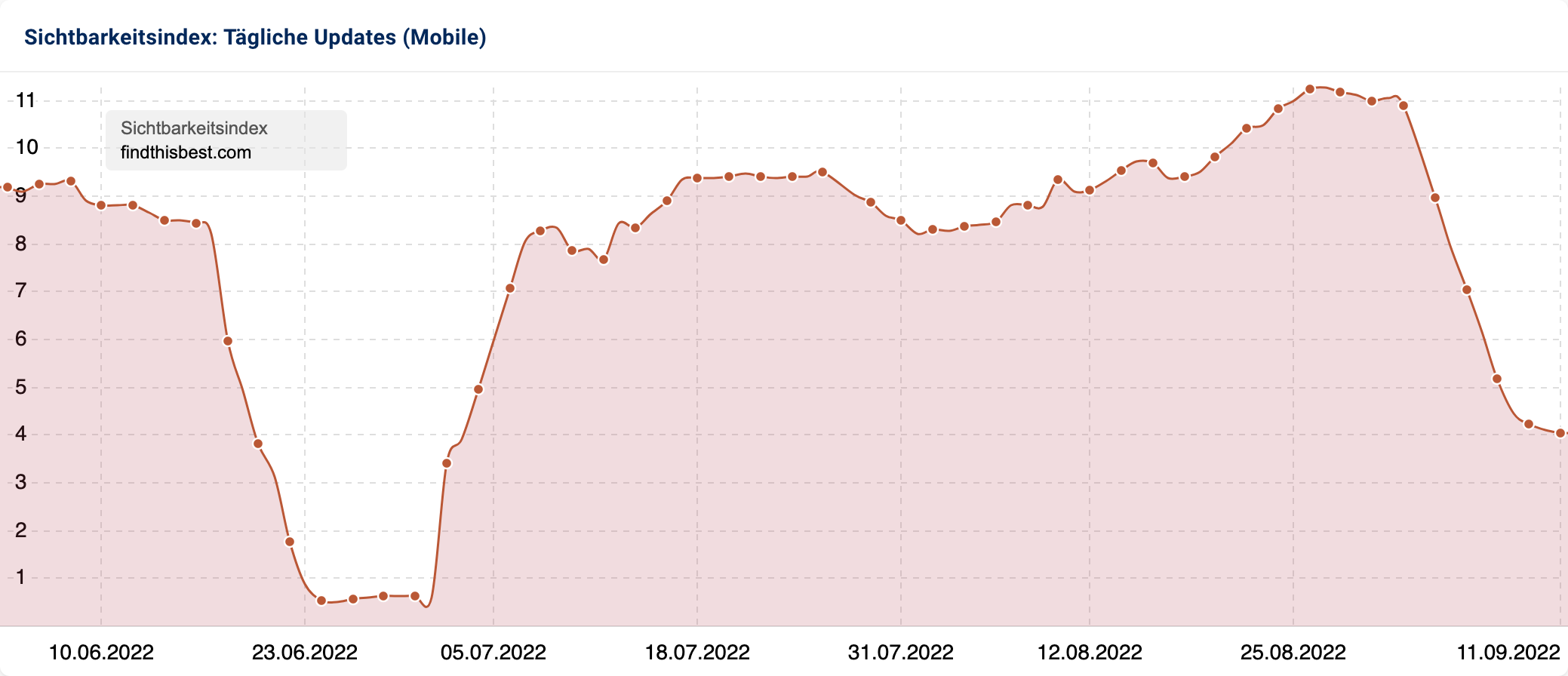In den USA gehört findthisbest.com, eine Plattform für Produktempfehlungen, zu den großen Verlierern dieses Updates. Für die Domain ging es von rund 10 auf 4 Sichtbarkeitspunkte um rund 60% nach unten. Interessant ist, dass die Domain ein paar Wochen vorher bereits einmal Sichtbarkeitsprobleme hatte: