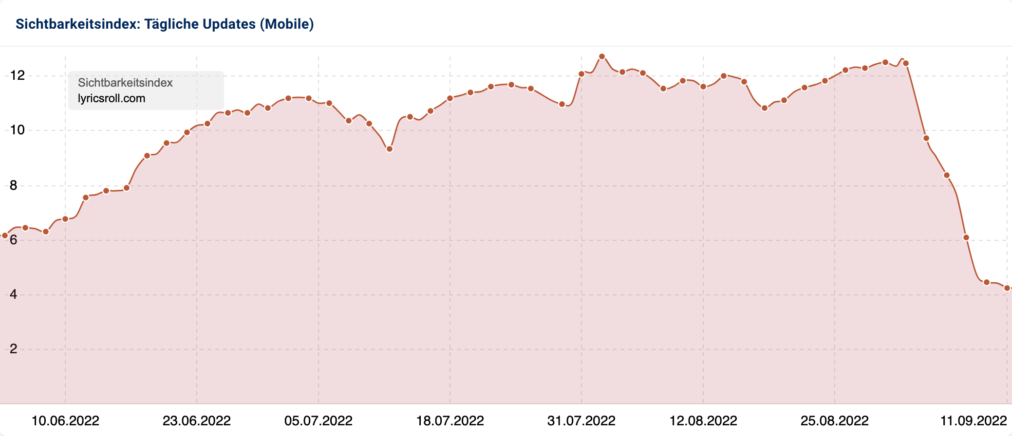 Beispielhaft für zahlreiche andere Domains aus dem gleichen Genre kann lyricsroll.com gelten: die Songtextesite hat von 12 auf rund 4 Sichtbarkeitspunkte rund zwei Drittel seiner Sichtbarkeit verloren: