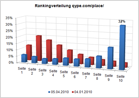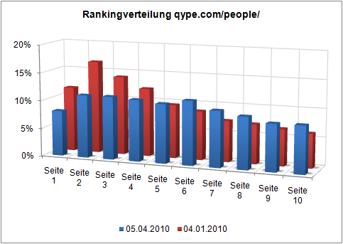 Zu sehen ist, auf welchen Ergebnisseiten bei Google (1 bis 10) die Keywords des betroffenen Unterverzeichnisses gefunden wurden. Das habe ich bereits vor geraumer Zeit als schöne Methode zur Feststellung von Ranking-Problemen vorgestellt und wird heute auch von zahlreichen anderen gerne genutzt. Im Diagramm ist im Hintergrund in Rot die Verteilung zu Anfang dieses Jahres zu sehen: ein, für große Contentwebseiten recht normales Bild. Im Vordergrund ist jetzt die aktuelle Verteilung. Über 60% der Keywords sind erst ab Seite 7 zu finden – für eine Keyword-Zurückstufung ein typisches Bild. Um sicherzugehen, dass ich mich nicht verrenne, noch kurz der gleiche Check mit dem „people“-Verzeichnis und die Erkenntnis, dass die Verschiebungen dort im normalen Rahmen sind. Wir können nun also davon ausgehen, dass Qype eine Google-Penalty in Form von Keyword-Zurückstufungen auf dem Unterordner „/place/“ hat.