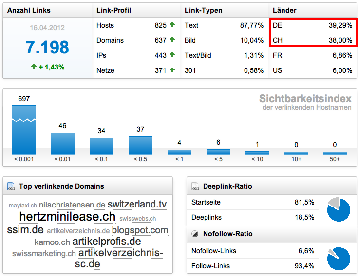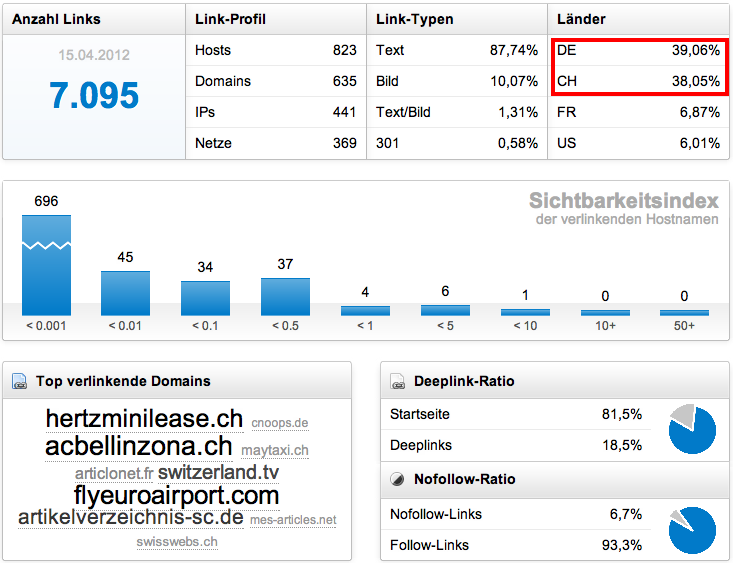 Eine mögliche Erklärung, warum Google immer wieder Probleme hat die geografischen Ziele der beiden Domains richtig zuzuordnen, findet man bei einem Blick auf das Backlinkprofil von hertz.ch. Dort sehen wir, dass die Websites nicht überwiegend Links aus der Schweiz bezieht, sondern ähnlich stark aus Deutschland verlinkt wird.