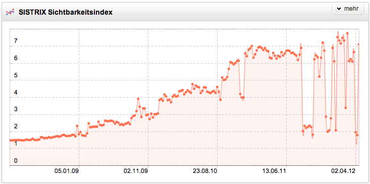 Werfen wir zuerst einmal einen Blick auf die Entwicklung des Sichtbarkeitsindex von hertz.de. Seit dem Jahr 2009 ist ein grundsätzlich schöner Anstieg in der Sichtbarkeit zu beobachten, der jedoch insbesondere seit dem August 2011 immer wieder durch bemerkenswerte Einbrüche getrübt wird.