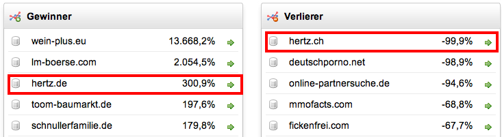 Bei der Durchsicht der Movers & Shakers der Woche sind mir bei den Daten für Deutschland heute in der Toolbox die Websites des Autovermieters Hertz aufgefallen. Die Domain hertz.de steht in den Top-3 der Gewinner und hertz.ch in den Top-3 auf der Verliererseite. Wir finden hier ein schönes Beispiel für das Geotargeting von Websites bei Google.