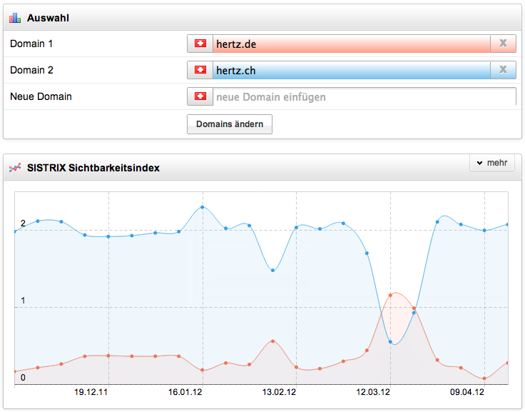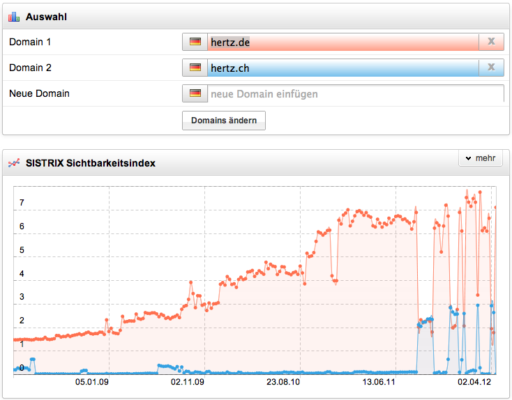Solchen typischen Zick-Zack-Muster im Sichtbarkeitsindex deuten vielmehr auf ein domainübergreifendes Duplicate-Content-Problem hin. Diese Vermutung bestätigt sich, wenn wir, wie im folgenden Screenshot dargestellt, in der Toolbox die Entwicklung des Sichtbarkeitsindex für die beiden Domains hertz.de und hertz.ch vergleichen.