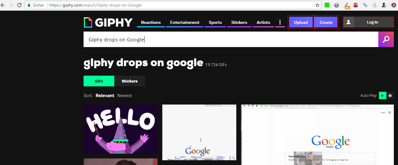 Probieren wir beispielhaft (das nicht so schmeichelhafte) „Giphy drops on Google„. Et voilà!
