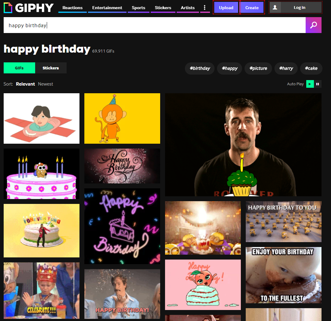 Gebe ich „happy birthday“ in Giphys Suchleiste ein, wird automatisch eine dazugehörige URL erstellt: https://giphy.com/search/happy-birthday – Ihr könnt es jedoch auch mit jeder x-beliebigen Wortschöpfung probieren (oder einfach eure Katze über die Tastatur laufen lassen) um eine eigene URL zu erschaffen.
