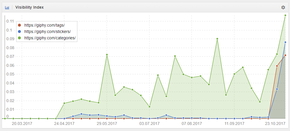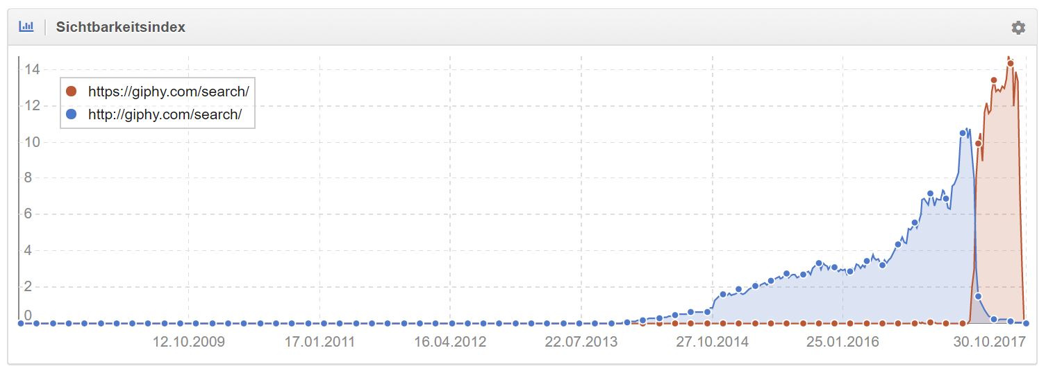 Hier wird sofort klar, dass 2 der 3 Subdomains auf Giphy.com keinen nennenswerten Einfluss auf die Sichtbarkeit bei Google haben und der Absturz komplett vom non-WWW Host http://giphy.com/ verantwortet wird.