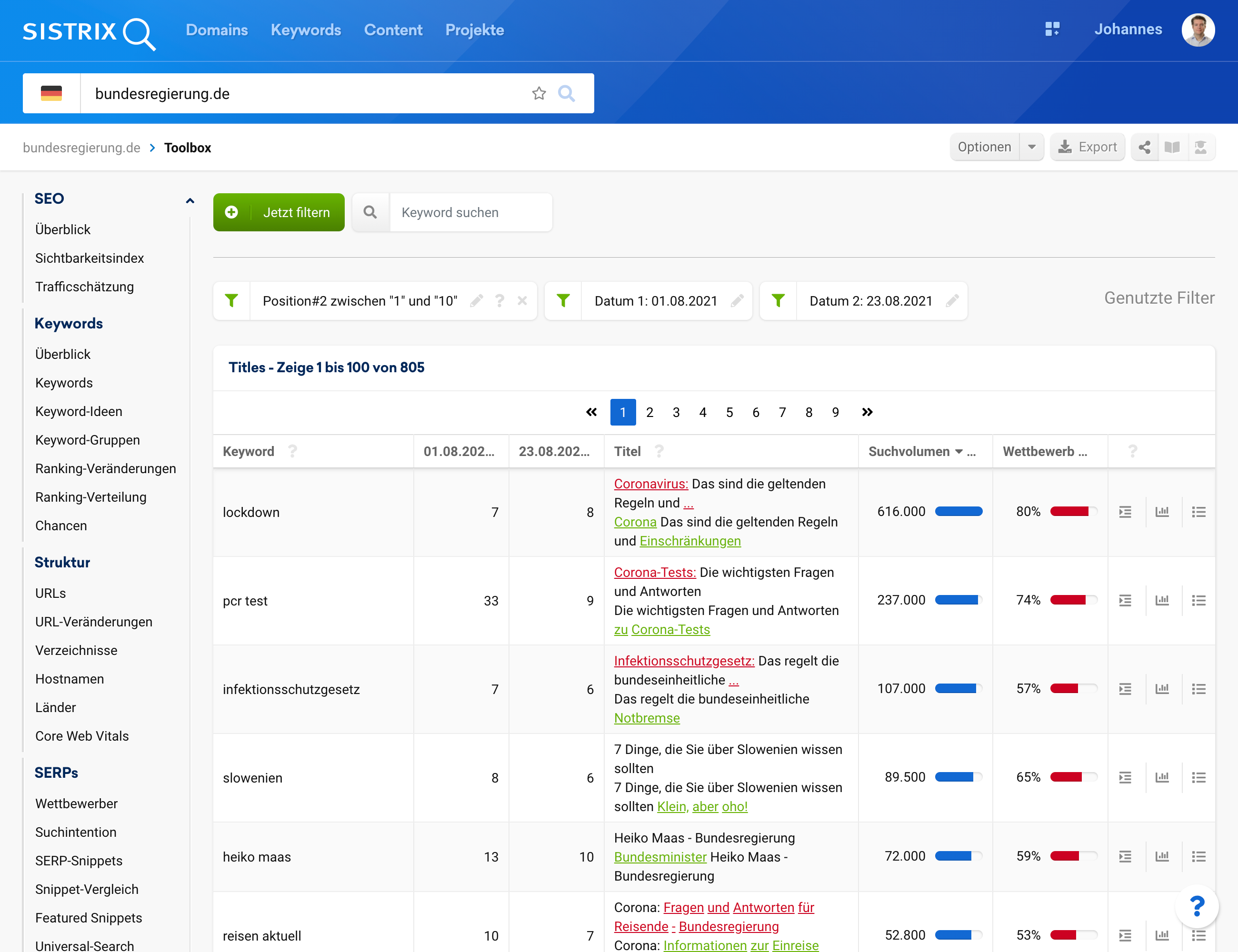 Da diese Änderung Auswirkungen auf die CTR und damit mittelfristig auf das Ranking haben kann, ist eine Überprüfung und gegebenenfalls Anpassung der angezeigten Titel der eigenen Webseiten anzuraten. SISTRIX bietet seit heute eine neue Funktion, um diese Überprüfung für jede beliebige Domain sofort und einfach durchzuführen.