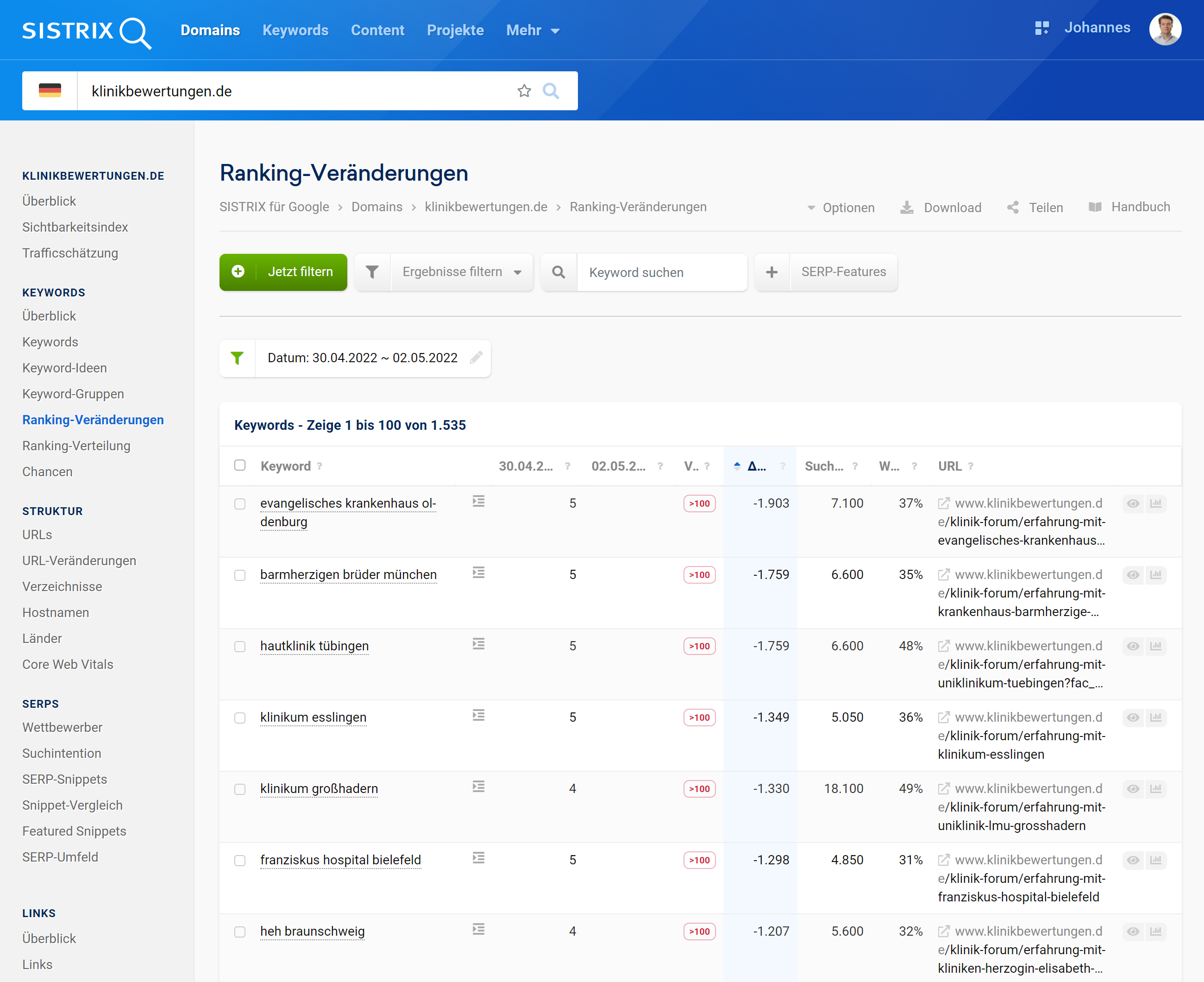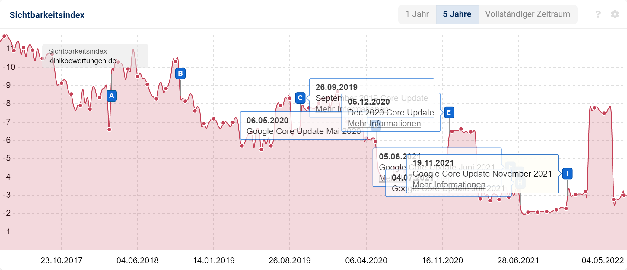Die Domain klinikbewertungen.de hat in den letzten 5 Jahren mit großer Zuverlässigkeit auf (fast) jedes Google Core Update reagiert: mal ging es hoch, mal ging es runter. Es gab jedoch immer eine Reaktion.