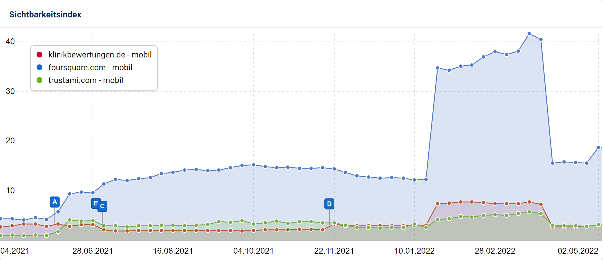Dass diese Veränderungen ihre Ursache nicht in Umstellungen der Domain haben, sieht man daran, dass andere, thematisch ähnlich gelagerte Domains zum gleichen Zeitpunkt ebenfalls massiv Sichtbarkeit gewonnen oder verloren haben.