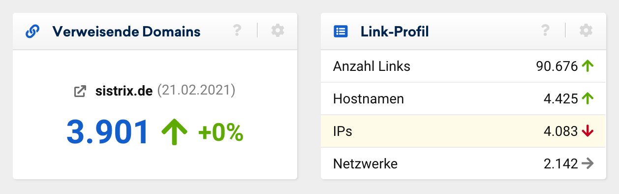 Anzahl verlinkender Domains – mein erster Blick geht auf die reine Anzahl der unterschiedlichen, verlinkenden Domains. Zwar lässt sich diese Kennzahl manipulieren, das ist aber deutlich schwieriger als die reine Linkanzahl. Auch sehe ich so, in welcher “Gewichtsklasse” die Domain unterwegs ist: hat sie nur wenige Links oder reden wir von vielen tausend, unterschiedlichen Links. (10 Sekunden)
