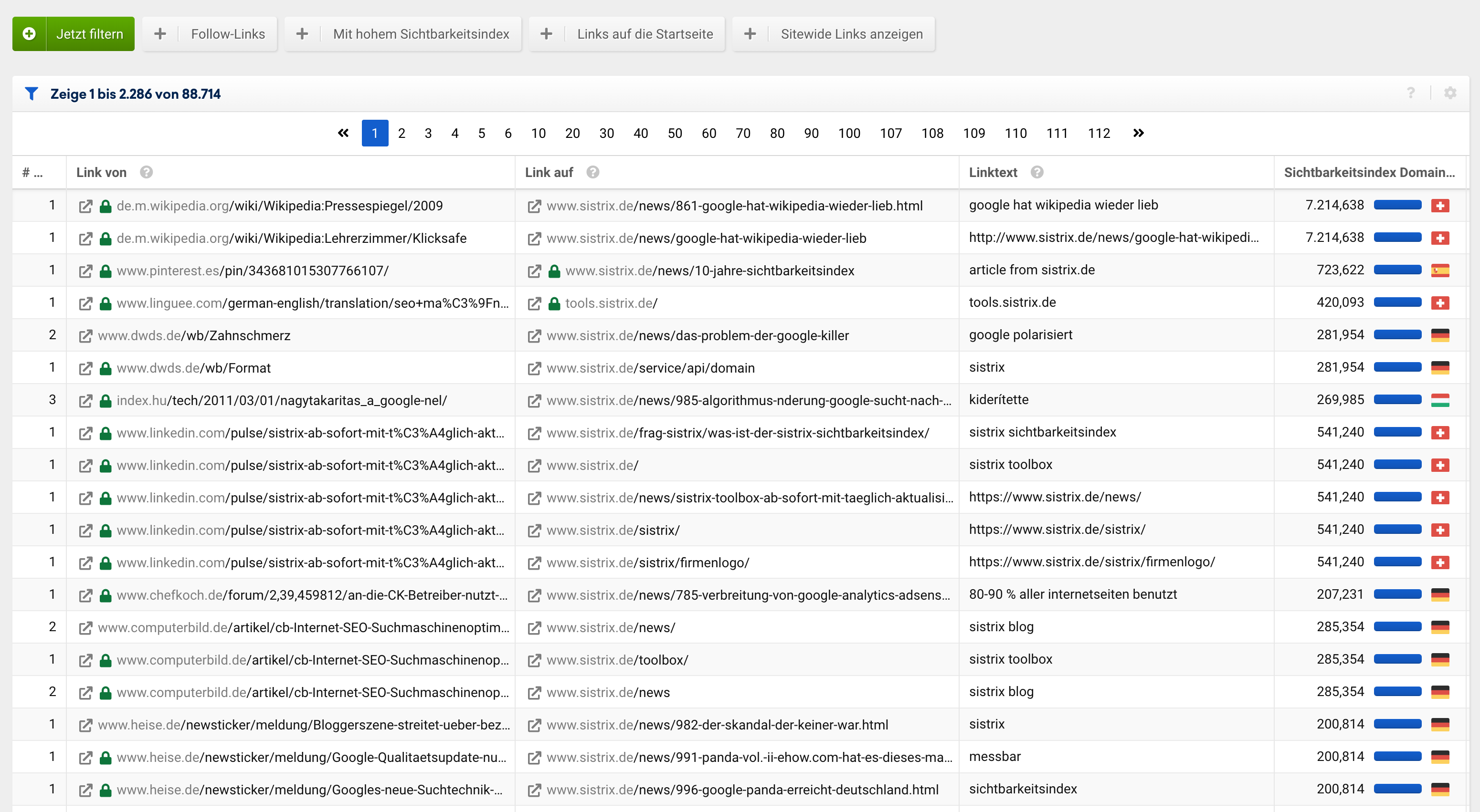 Stichprobe Links mit der höchsten Sichtbarkeit – der dritte Blick geht dann auf die Links selber. In SISTRIX sind Links in der Standardeinstellung bereits absteigend nach dem Sichtbarkeitsindex sortiert, so dass ich schnell die vermutlich stärksten Link einer Domain überfliegen kann und einen guten Eindruck von der Qualität der eingehenden Links erhalte. (30 Sekunden)