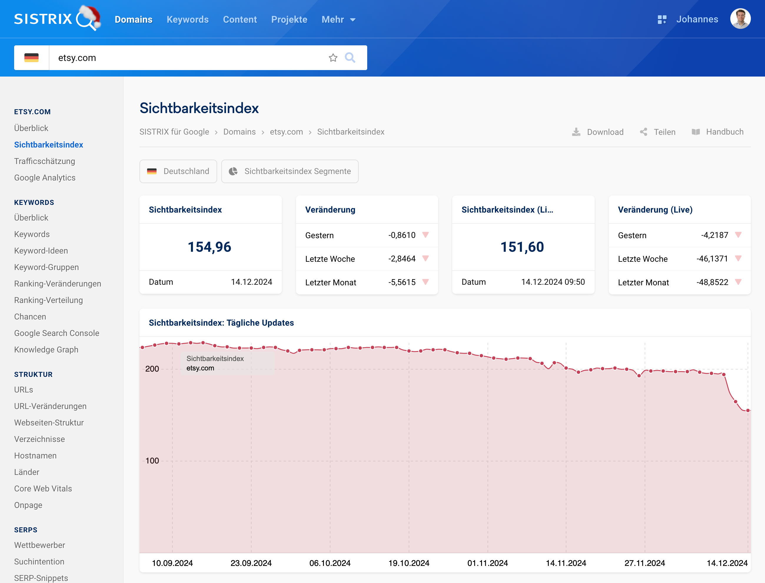 Doch diese Entwicklung scheint mit dem Google Core Update vom Dezember 2024, das seit letzter Woche ausgerollt wird, zumindest vorerst gestoppt. Der Teil der Reddit-Sichtbarkeit, der auf den automatisierten Übersetzungen basiert, ist seitdem deutlich zurückgegangen – in Deutschland beispielsweise von 77 auf aktuell nur noch 56 Sichtbarkeitspunkte.