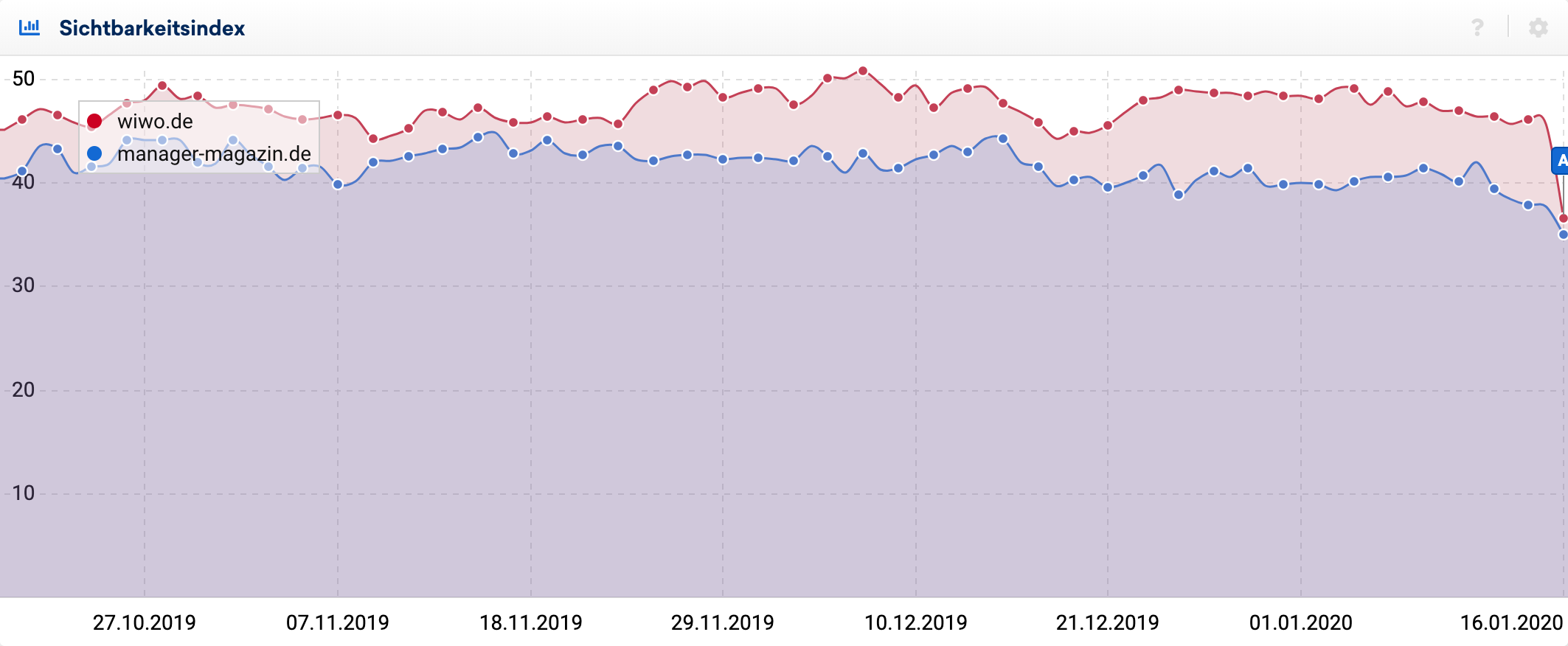 Mit den letzten Core Updates hat Google den Kreis betroffener Themen und Branchen ausgeweitet. Auch bei diesem Update zeigt sich dieser Trend: dass mit der Wirtschaftswoche und dem Manager Magazin zwei inhaltlich ähnliche, vom Aufbau und CMS aber grundunterschiedliche Domains betroffen sind, unterstützt diese Theorie. In den täglichen Sichtbarkeitsindex-Daten der Toolbox siehst du erste Auswirkungen mit Datum von Mittwoch, die großen Veränderungen ab heute (Donnerstag, 16.01.)