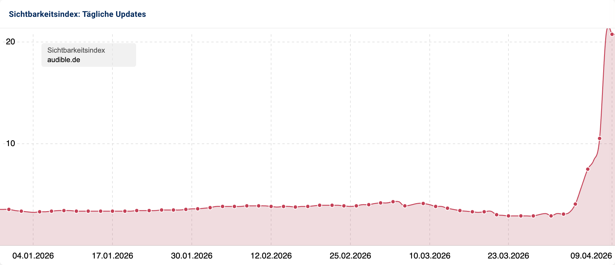 Audible.de ist mit +172% der größte Gewinner dieses Updates. Die Domain lag wochenlang stabil bei einem SI von rund 3. Erst ab dem 3. April, eine Woche nach Update-Start, begann der Anstieg: von 3,2 über 4,1 und 5,9 auf über 8. Core Updates rollen nicht bei allen Domains gleichzeitig aus. audible.de ist ein Beispiel für eine Domain, bei der der Effekt erst in der zweiten Woche des Rollouts einsetzte.