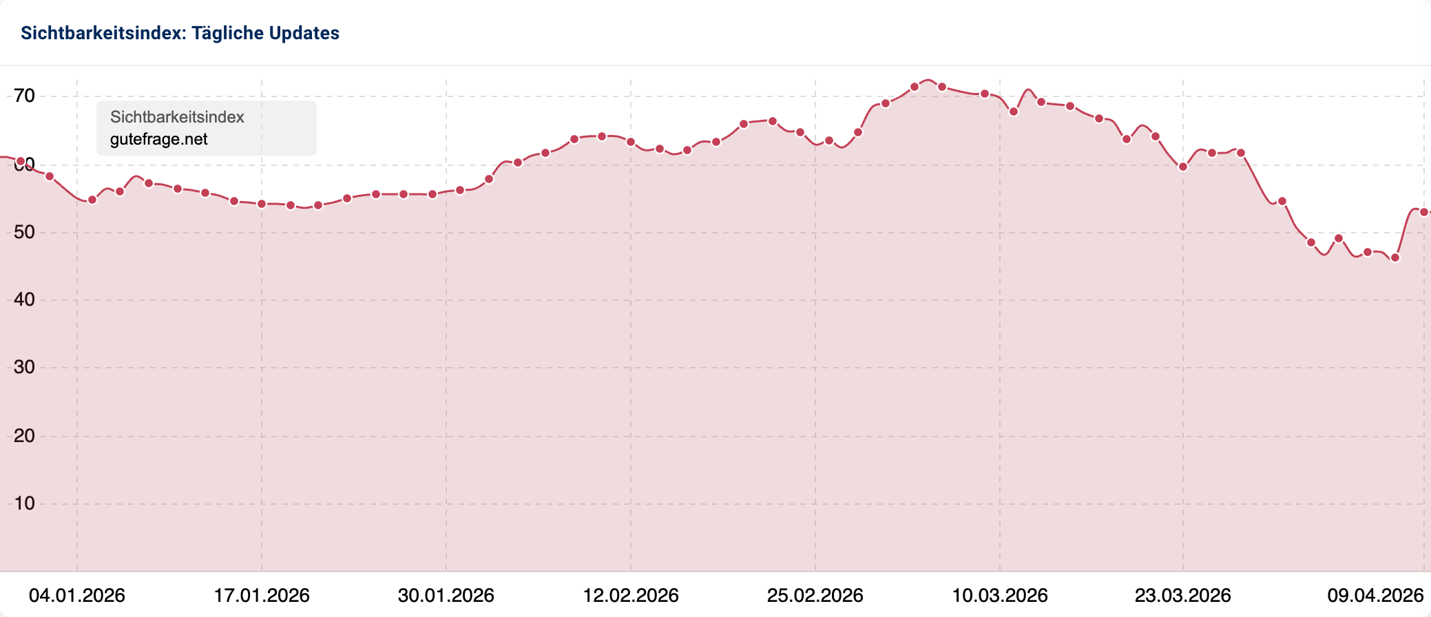 Gutefrage.net erzählt dabei eine eigene Geschichte. Die Domain hatte ihren Höchststand beim Sichtbarkeitsindex bei 127 im Frühsommer 2025. Seitdem ging es bergab: Anfang 2026 lag der SI nur noch bei 54. Zwischen Februar und März erholte sich die Domain leicht auf rund 70, bevor das Core Update sie wieder auf 47 drückte. Ob Google hier bewusst UGC-Inhalte abwertet oder ob gutefrage.net ein spezifisches Qualitätsproblem hat, ist aus den Daten nicht ableitbar. Klar ist: Der Abwärtstrend hält an, und das Core Update hat ihn beschleunigt.