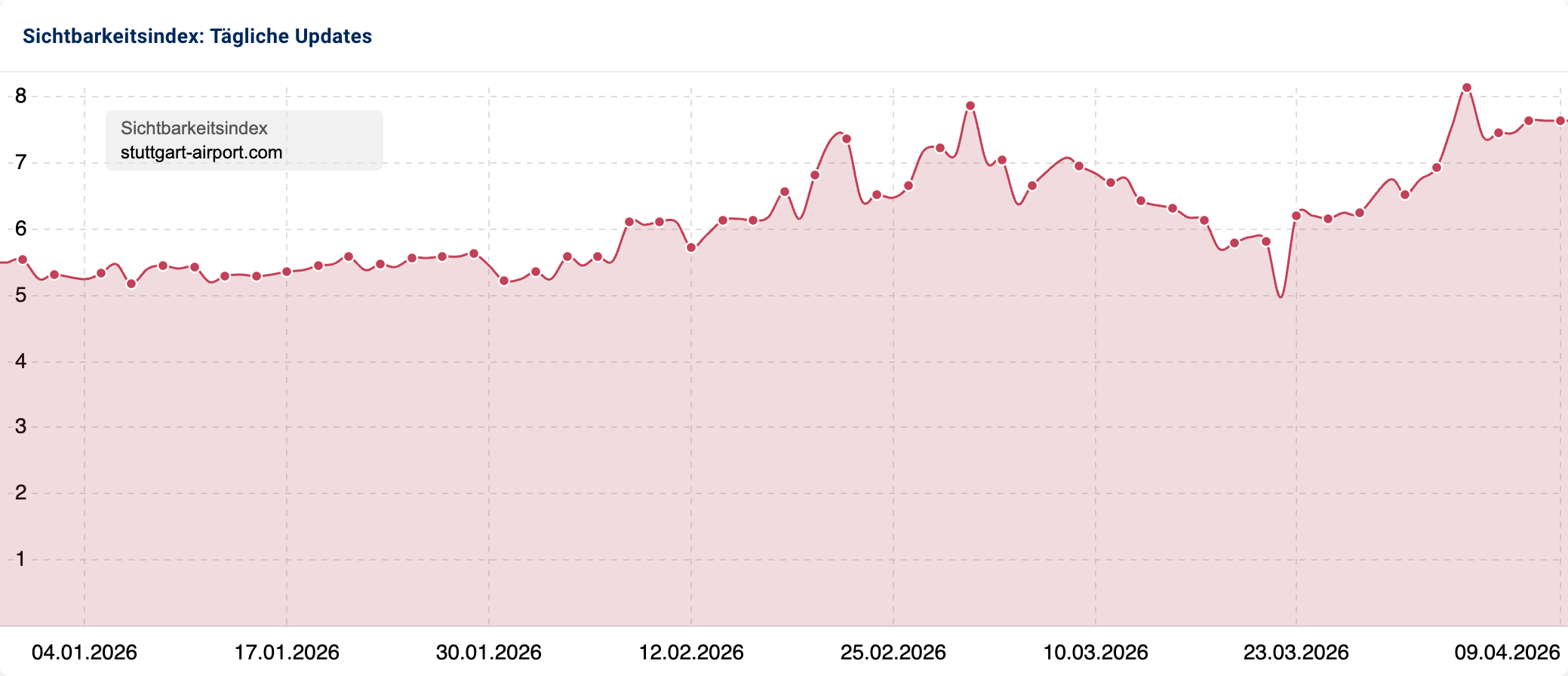 Die vier Flughafen-Domains zeigen ein nahezu identisches Muster. Alle waren in den Wochen vor dem Update stabil. Ab dem 1. April stiegen die SI-Werte parallel an und stabilisierten sich auf einem neuen Niveau. Bei stuttgart-airport.com stieg der SI von 6,2 auf 7,6, bei hamburg-airport.de von 6,8 auf 8,0. Dieses Cluster-Verhalten ist ein starkes Indiz dafür, dass Google eine systematische Änderung vorgenommen hat.