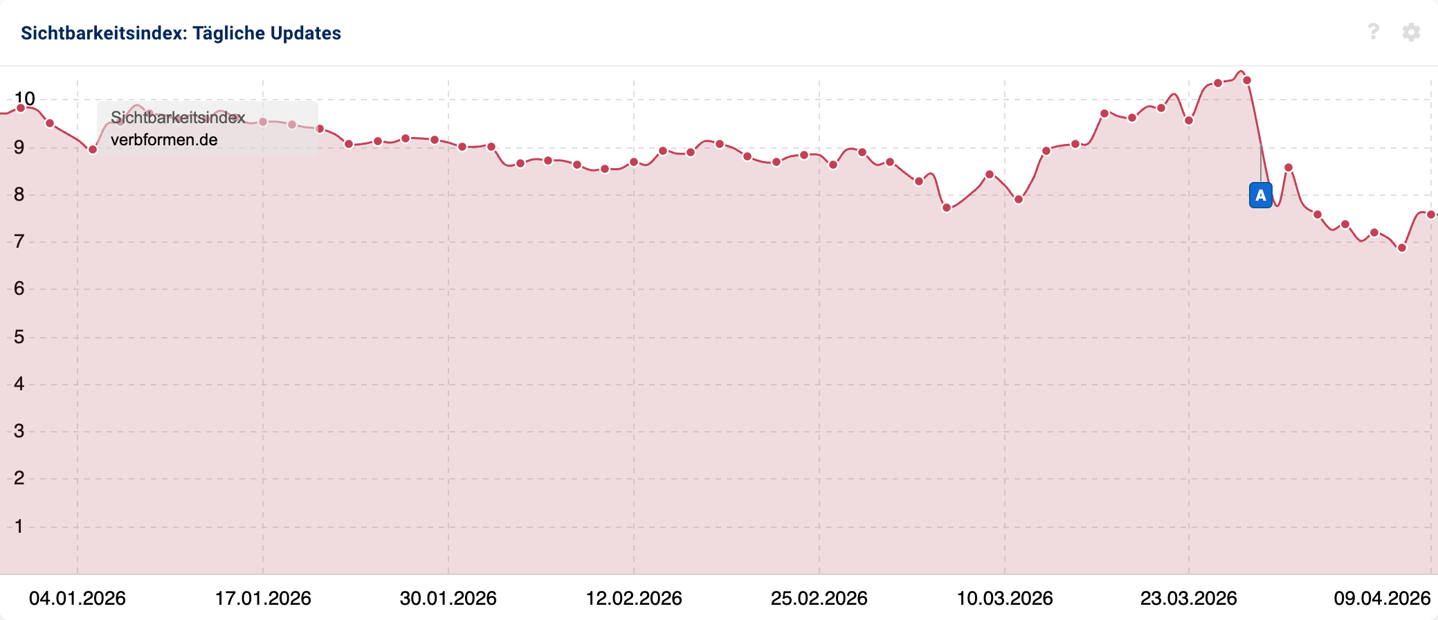 verbformen.de zeigt den Lehrbuch-Effekt eines Core Updates. Der Sichtbarkeitsindex lag in den Wochen vor dem Update stabil bei rund 10. Am 29. März, zwei Tage nach Update-Start, fiel er auf 7,8 und pendelte sich in den folgenden Tagen bei 7,0 bis 7,6 ein. Ein klarer Niveauwechsel, kein Rauschen, kein vorheriger Trend.