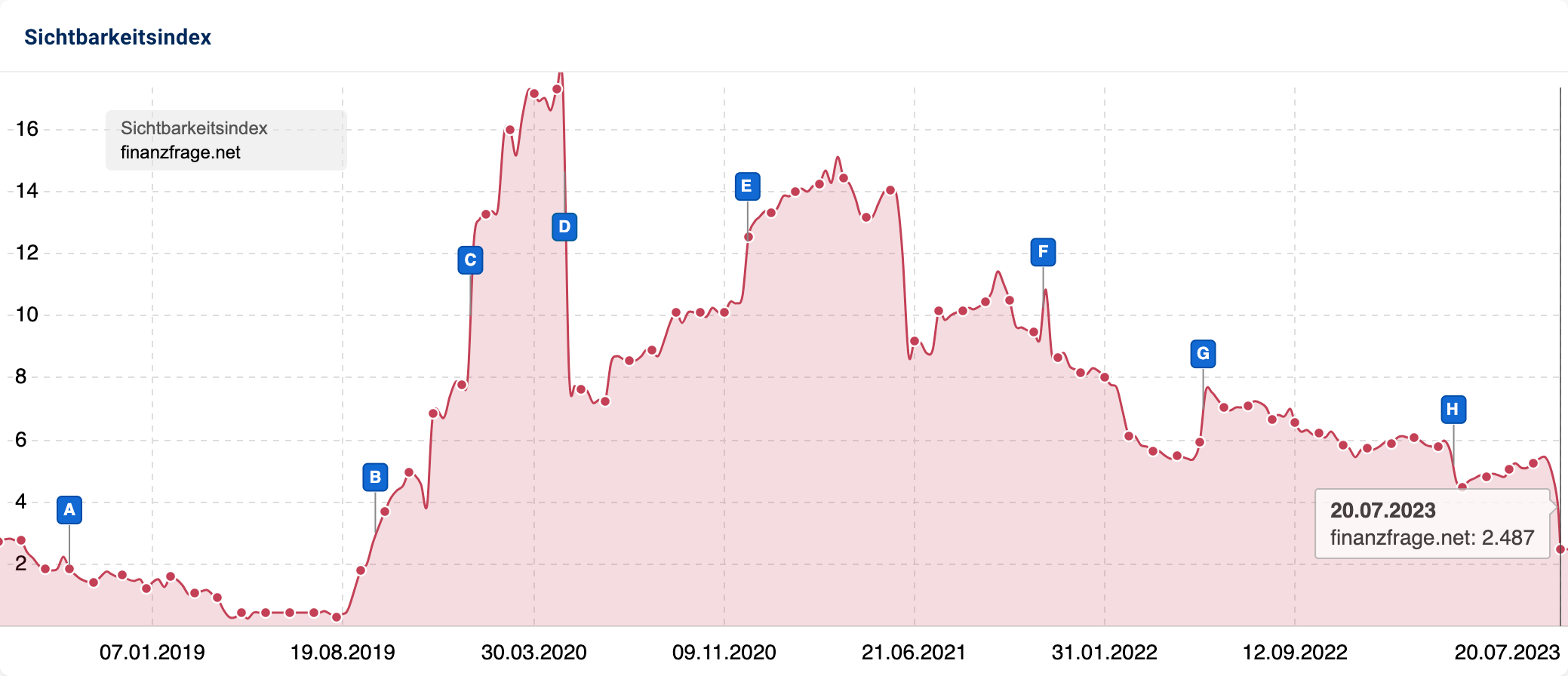 Aktuell gibt es in den Suchergebnissen Bewegungen, die eindeutig die Charakteristika eines Core Updates haben. Nur fehlt bislang eine Ankündigung oder Bestätigung von Google. Deutlich wird das beispielsweise am Sichtbarkeitsindex von finanzfrage.net:
