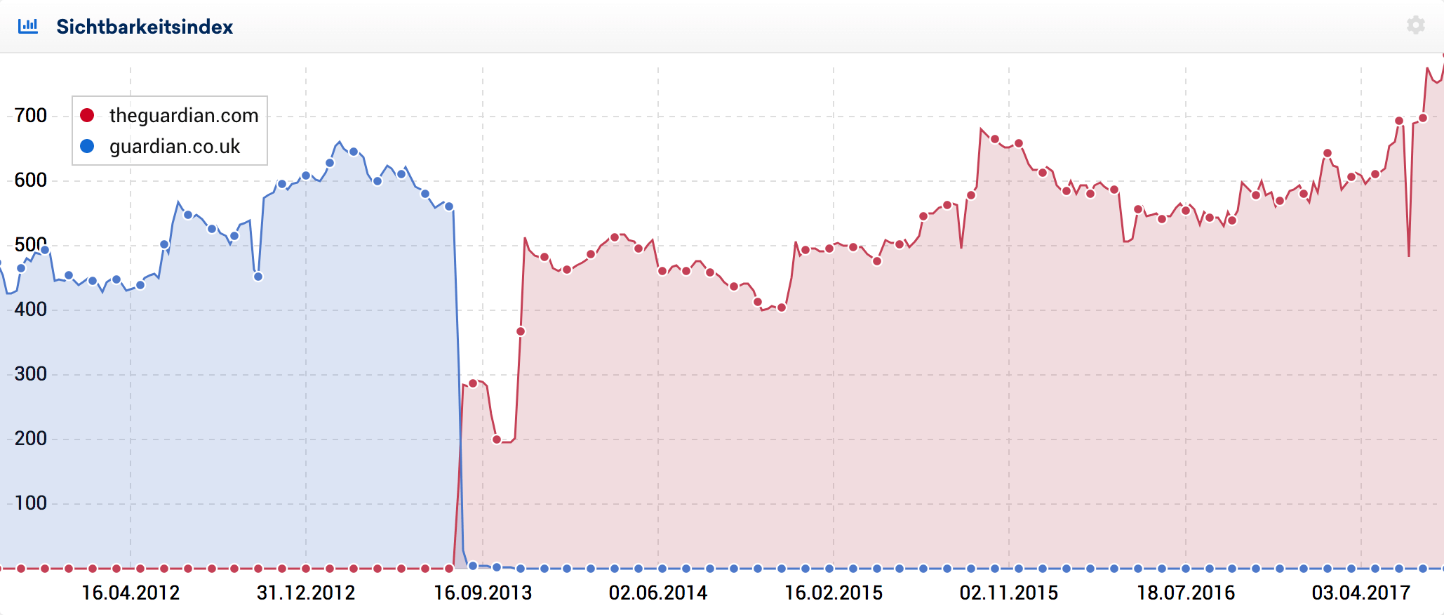 Bei The Guardian, dem britischen Newsportal, ist die Zeitspanne ähnlich. Auch hier brauchte es ca. drei Monate, bis an den alten Sichtbarkeitskurventrend mit der neuen Domain angeschlossen werden konnte.