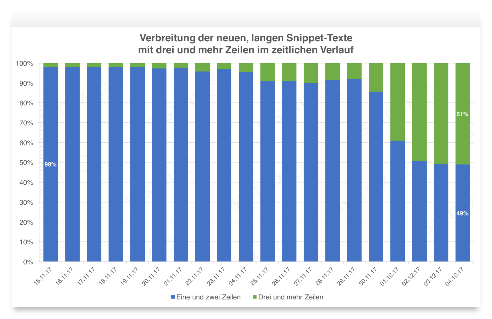 Um zu prüfen, wie weit sich diese Änderung bereits in den SERPs verbreitet hat, haben wir die Anzahl der Zeilen der Snippet-Texte seit Mitte November analysiert und in diesem Diagramm zusammengefasst: