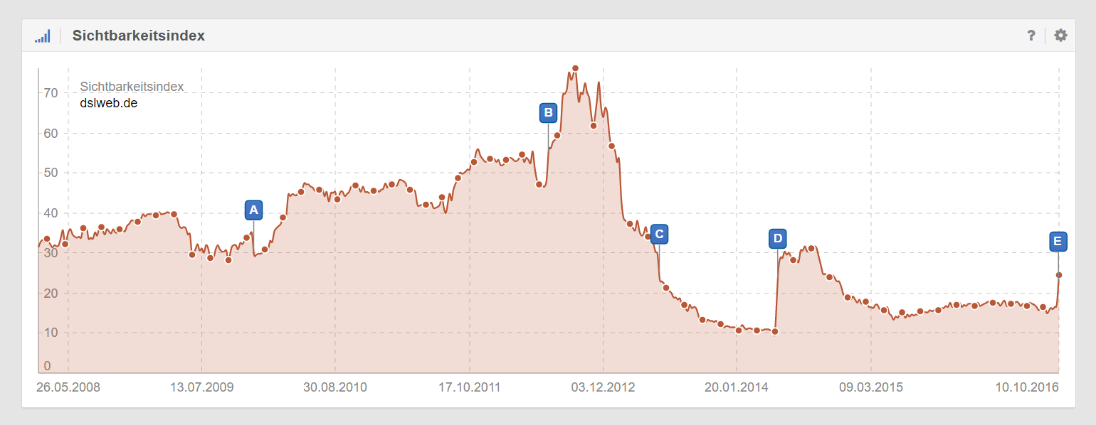 Die gleichen Anzeichen sieht man bei dslweb.de – der tägliche Sichtbarkeitsindex geht seit ein paar Tagen hoch, der Smartphone-Sichtbarkeitsindex ist diese Woche auch deutlich nach oben geschossen. Klickt man sich durch die Toolbox, so finden sich solche Anzeichen in dieser Woche bei zahlreichen Domains – Google macht also endlich erst und lockert alte Penguin-Penaltys.