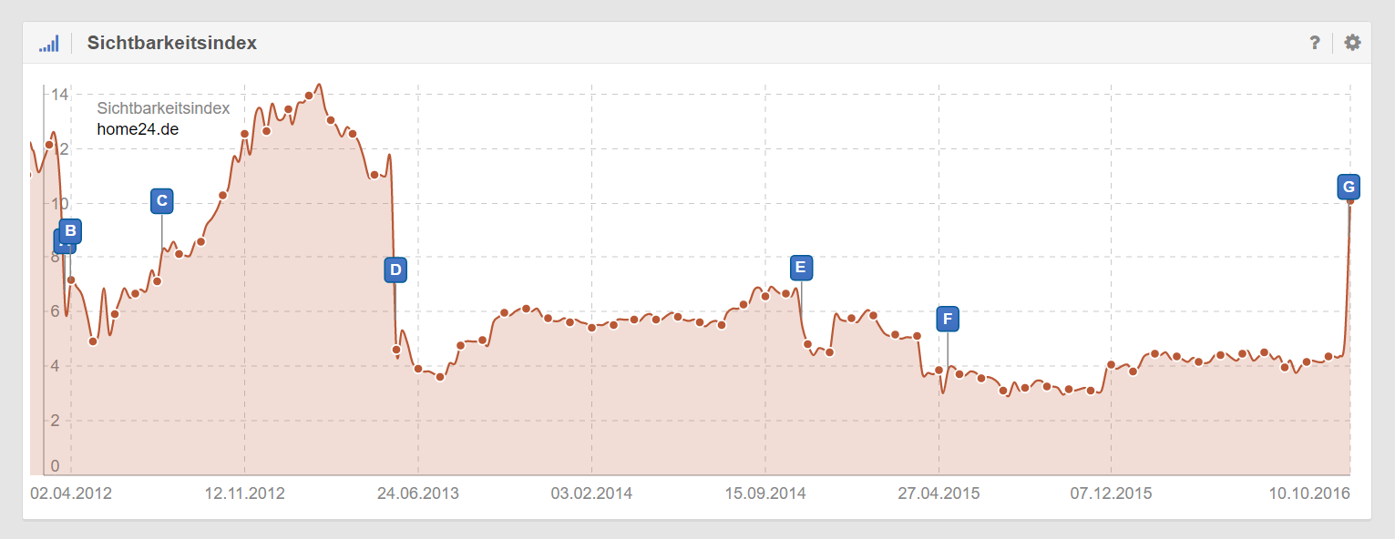 Home24.de ist häufig das Standard-Beispiel, wenn es um Folgen von Penguin geht. Falsche Entscheidungen in der Vergangenheit haben dazu geführt, dass die Domain seit Mitte 2013 von Penguin betroffen war und auch trotz zahlreicher, tiefgreifender Maßnahmen nicht mehr rauskam. In dieser Woche konnte home24.de seinen Sichtbarkeitsindex verdoppeln. Interessant zu beobachten ist zum einen, dass der Smartphone-Sichtbarkeitsindex zur gleichen Zeit stark nach oben gegangen ist – diese beiden Google-Indizes hängen also offenbar noch eng zusammen. Zum anderen sieht man in unserem täglichen Sichtbarkeitsindex sehr anschaulich, dass es erst seit drei, vier Tagen Veränderungen gibt – vorher hat der Filter also noch gegriffen.