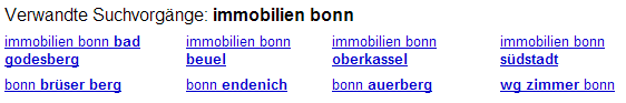 Von „immobilien bonn“ kommt Google so auf „wg zimmer bonn“. Schon recht nett und wird das Suchverhalten wohl weiter Richtung Long-Tail treiben.