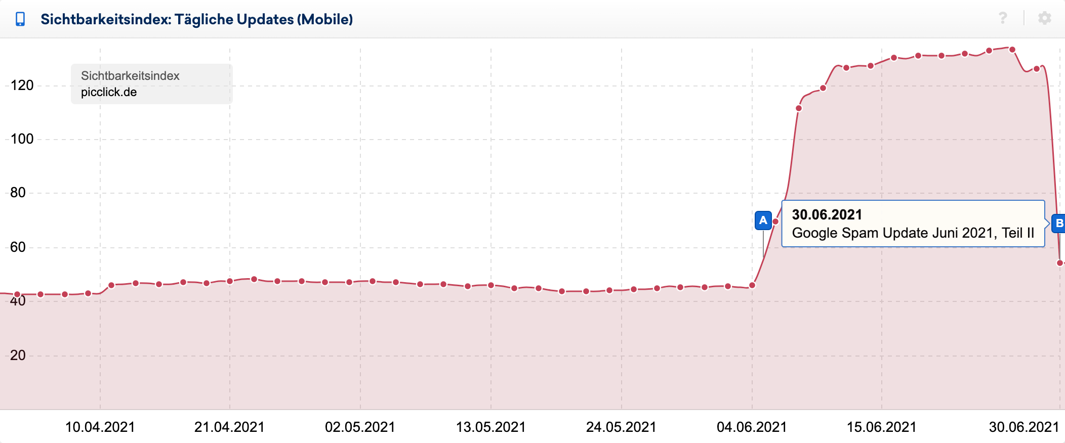 Die Auswirkungen des zweiten Spam Updates scheinen größer als die des ersten Updates: wir sehen bei betroffenen Domains im Durchschnitt prozentual stärkere Veränderungen in der Sichtbarkeit.