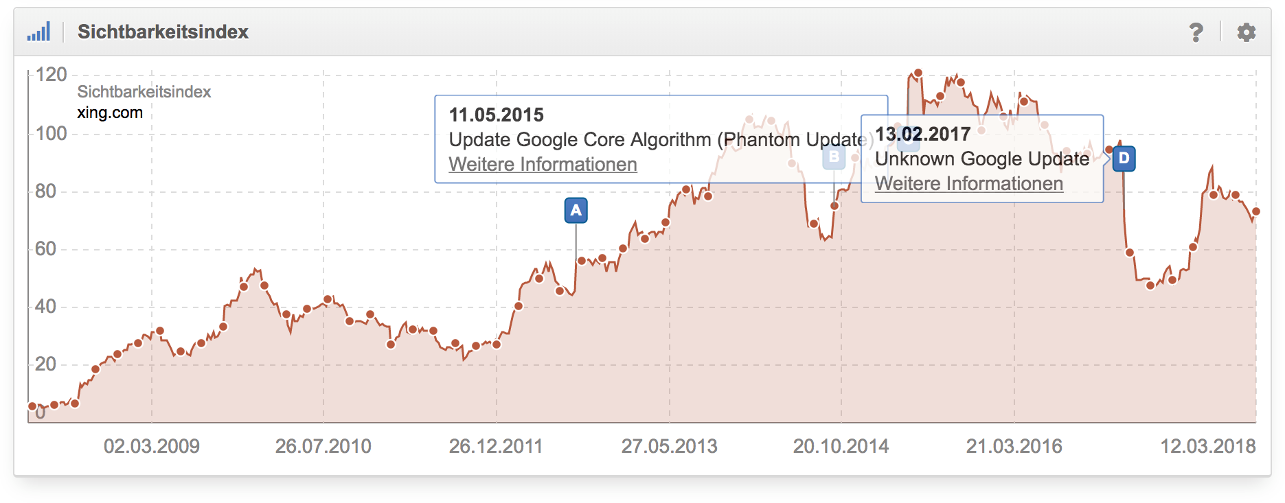 Und genau dieses Muster scheint für das Update charakteristisch zu sein. Man findet es sowohl bei Verlierern wie Indeed.com als auch bei Gewinnern wie Xing.com. Es ist nicht bei allen Domains so deutlich ausgeprägt wie hier, doch meistens klar erkennbar.