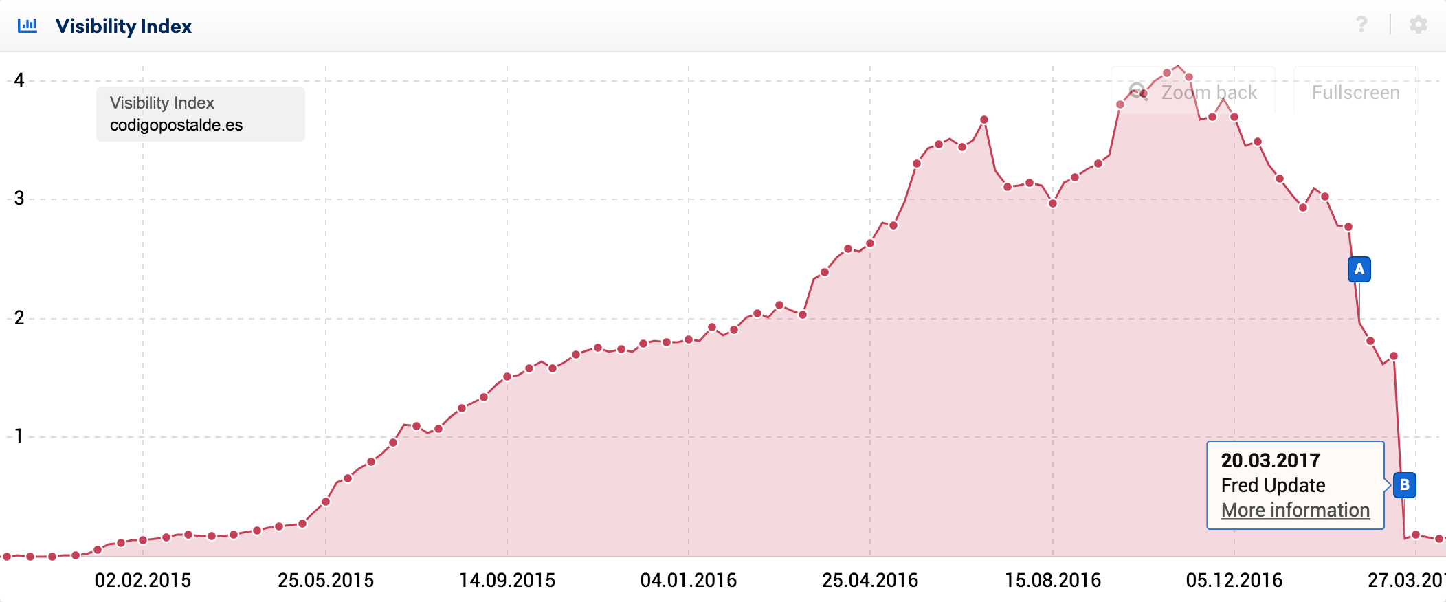Barry berichtet, dass Google ein Update für den März 2017 bestätigt hat. Da wir nun wissen wo wir suchen müssen, habe ich mir 300 Domains aus den Google Indizes der USA, Großbritannien, Deutschland und Spanien angeschaut, welche seit dem 13 März 2017 an Sichtbarkeit verloren haben. Fast alle dieser Webseiten hatten wenige oder qualitativ minderwertige Inhalte, bei denen es keinen Mehrwert für die Nutzer gibt. Des Weiteren fiel auf, dass viele dieser Seiten sehr stark mit Werbung überladen waren, häufig mit Werbebannern bei denen viele AdSense Kampagnen dabei waren.
