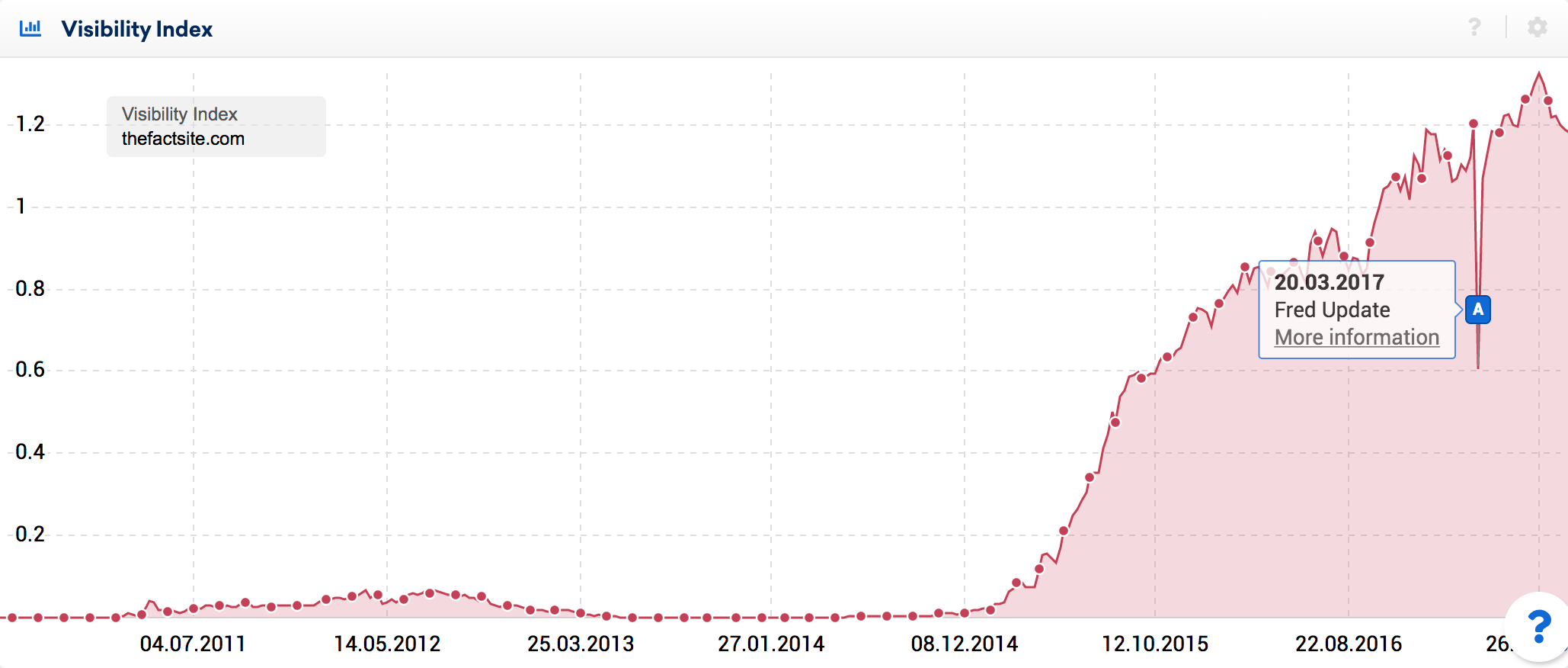 Wir sehen zwei AdSense Blöcke im direkt sichtbaren Teil der Seite, wobei der Obere den Main Content sogar noch weiter nach unten verschieben kann, wenn ein größeres Werbemittel ausgeliefert wird. So wie es aussieht hat Thefactsite.com die Rankingverluste schnell bemerkt und mit einem Layoutupdate reagiert. Schauen wir uns die Webseite heute an, finden wir nur einen Werbeblock und auch der Sichtbarkeitsindex hat sich diese Woche wieder erholt.