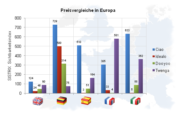 Die Domain ist in England nochmals stärker als bei uns im Index vertreten, in Spanien etwa auf gleichem Niveau und in Frankreich und Italien seltener so prominent zu finden. Wenn man sich die Anzahl der Artikel in der jeweiligen Länderversion von Wikipedia.org ansieht, entspricht das übrigens in etwa diesem Ranking. Interessant sind diese Zahlen auch, wenn man sie als Grundlage für den Vergleich von ähnlichen Seiten nimmt, die jeweils lokale Versionen anbieten. Hier habe ich den Sichtbarkeitsindex von vier bekannten Preisvergleichen in einem Diagramm eingezeichnet: