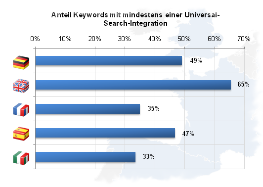 Bei Twenga fällt ein starkes Nord-Süd-Gefälle auf: in Frankreich, Italien und Spanien sehr stark, bekommt der Preisvergleich in Deutschland und England nicht so richtig einen Fuß auf den Boden – das liegt in England allerdings offenbar auch daran, dass es Preisvergleiche in dem dortigen Index generell schwerer haben. Im gesamt-europäischen Vergleich am erfolgreichsten ist derzeit Ciao. Mal sehen, wie lange das nach dem Kauf durch Microsoft und der Kartellrechtsbeschwerde gegen Google noch so bleibt. Neben den Daten aus dem SEO-Modul sind natürlich auch die für das SEM- und Universal-Search-Modul verfügbar. In folgendem Diagramm habe ich den Anteil der SERPs mit mindestens einer Universal-Search-Integration ausgewertet:
