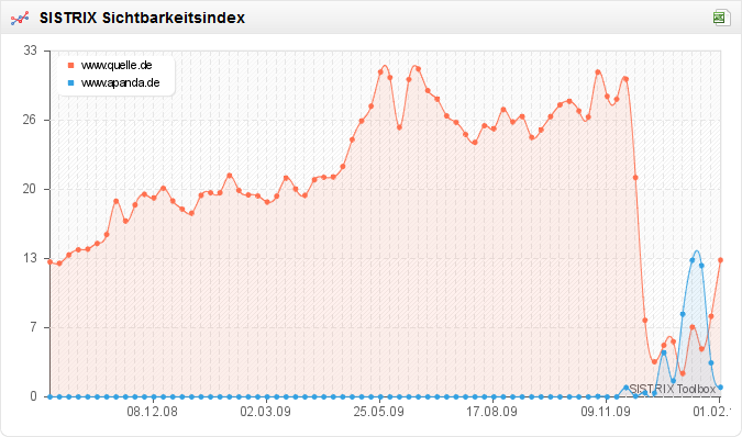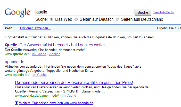 Quelle.de gewinnt langsam wieder an Sichtbarkeit, nachdem es im Zuge der Insolvenz und nahezu kompletten Abschaltung der Webseite in den letzten Monaten deutlich nach unten ging. Es ist war noch ein weiter Weg, bis die Domain ihre alte Stärke erlangt hat, die Richtung stimmt allerdings. Interessant ist in dem Zusammenhang, dass Google offenbar zeitweilig die Domain „apanda.de“ für einen legitimen Nachfolger von „quelle.de“ gehalten hat. Das konnte man zum Beispiel daran festmachen, dass diese Domain bei der Suche nach „quelle“ gefunden wurde. Ob das ein Fehler im Google-Algorithmus ist oder andere Sachen gelaufen sind, kann ich nicht beurteilen, spannend wären die Hintergründe in meinen Augen trotzdem.