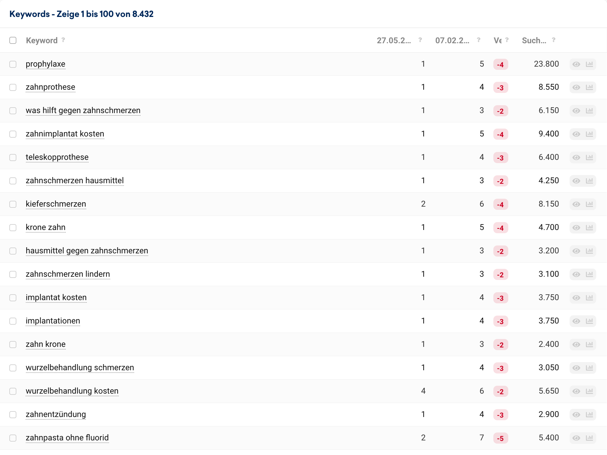 Ein Blick auf die Liste der Keywords, die für die größten Sichtbarkeitsverluste verantwortlich sind zeigt, dass die Domains zahlreiche Platz 1 Positionen zu sehr suchvolumenstarken Keywords verloren hat: