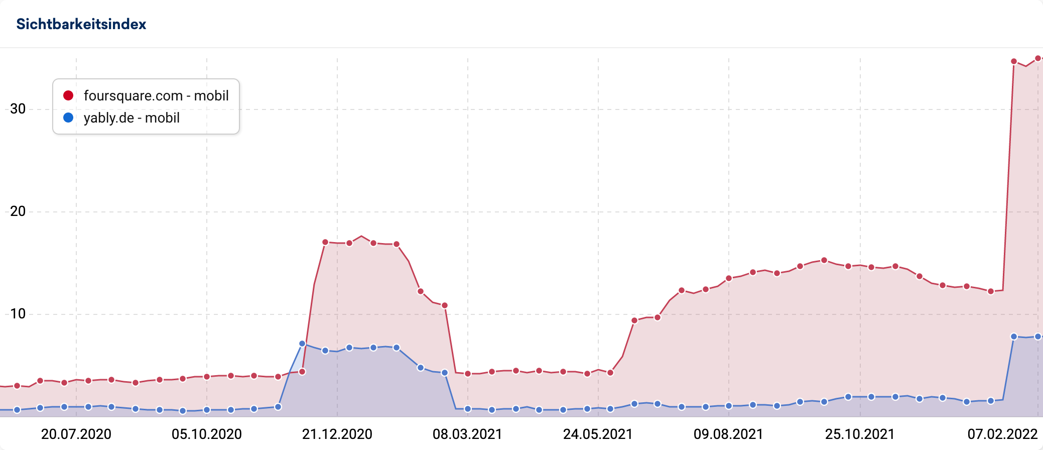Für die Sichtbarkeit sorgt Foursquares City Guide, der hauptsächlich für Unternehmensbezeichnungen rankt und einen massiven Sprung hingelegt hat. Also ein ganz ähnliches Muster wie bei yably.