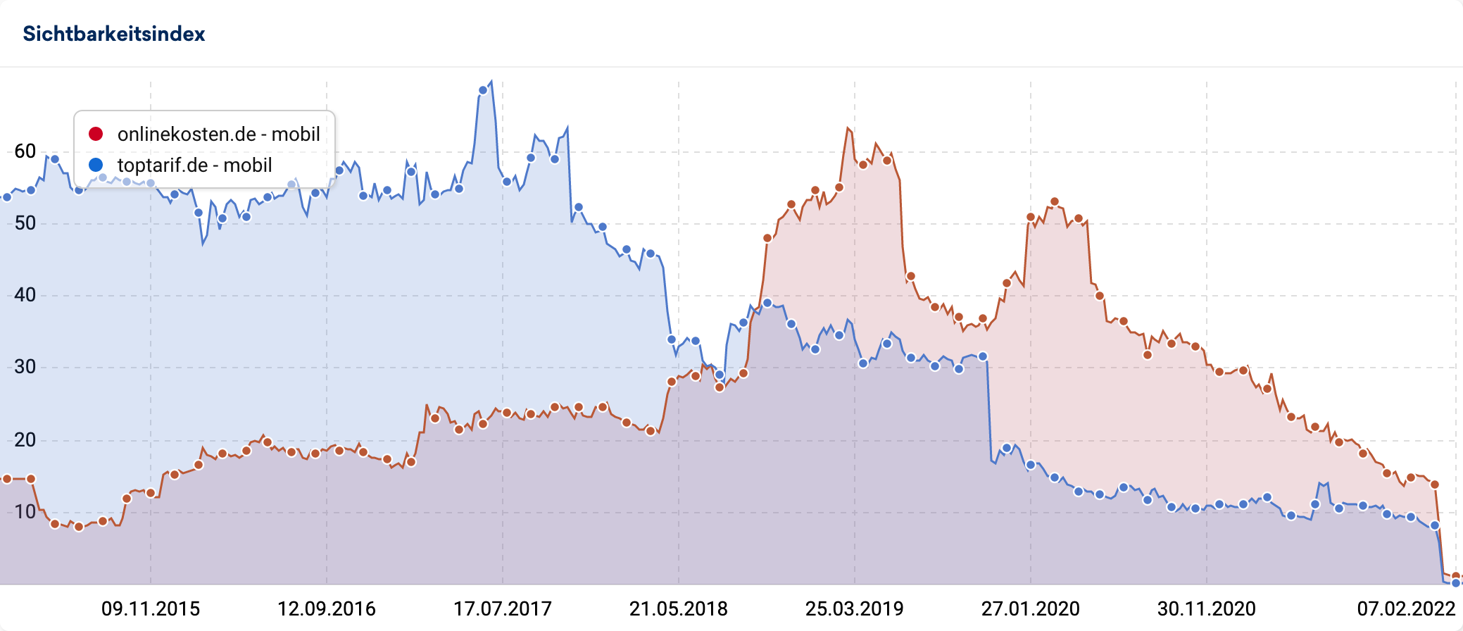 Legt man die Sichtbarkeitsentwicklung beider Domains übereinander zeigt sich ein klares Bild: Hier gab es zu mindestens drei Zeitpunkten eine gleichzeitige Veränderungen beider Domains: