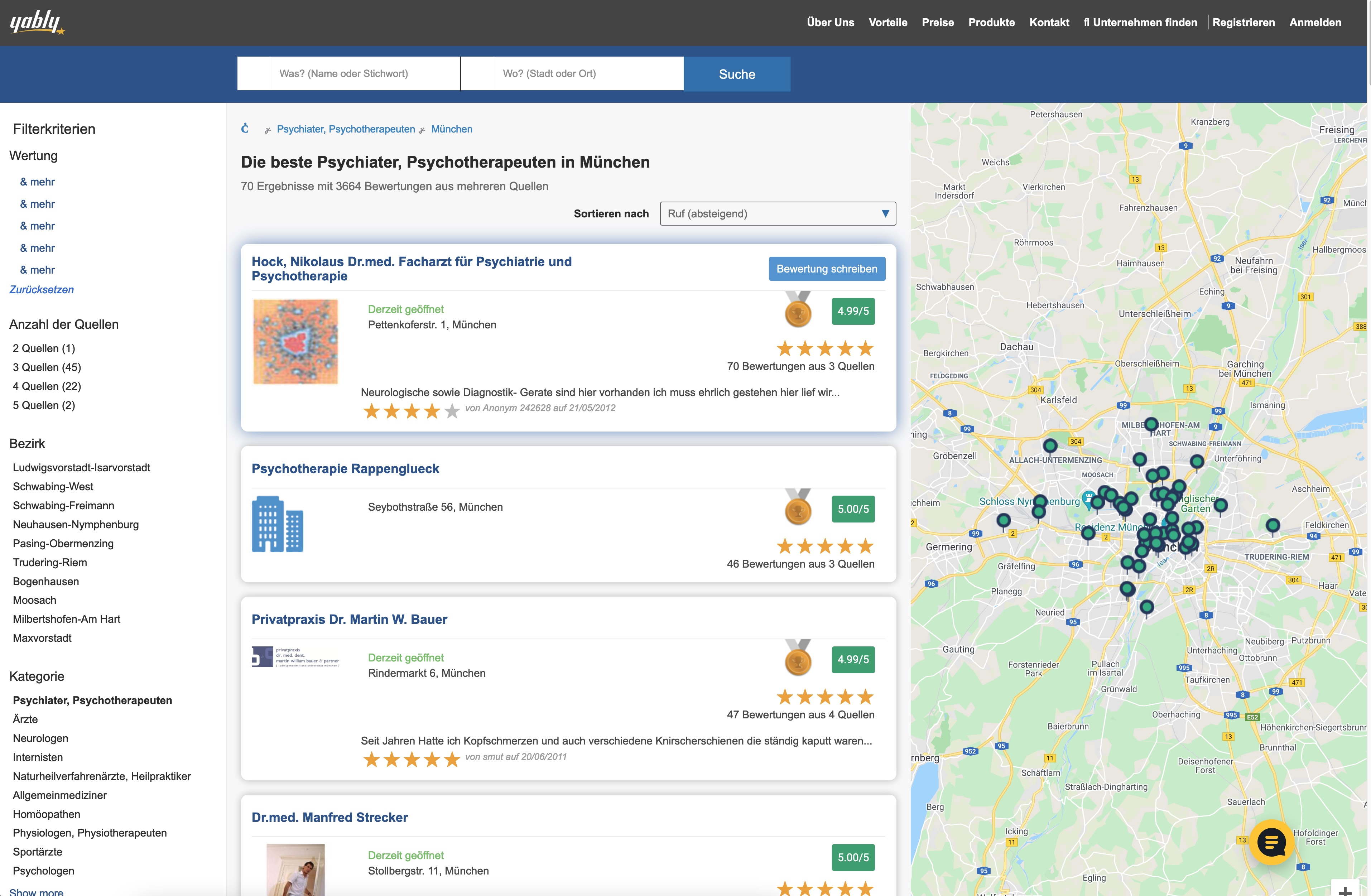 Bei genauerem Blick fällt auf, dass yably offenbar die gleiche Unternehmens-Datenbank zugrunde liegt, die man bereits von cylex kennt. Zusätzlich durchforstet yably das Netz nach Bewertungen zu den Unternehmen.